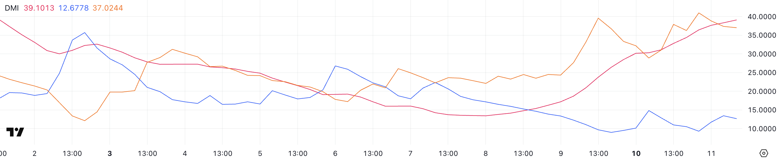 Dogecoin का Directional Movement Index (DMI) चार्ट दिखाता है कि इसका Average Directional Index (ADX) वर्तमान में 39.1 पर है, जो सिर्फ दो दिन पहले 17.1 से एक तेज वृद्धि है।
