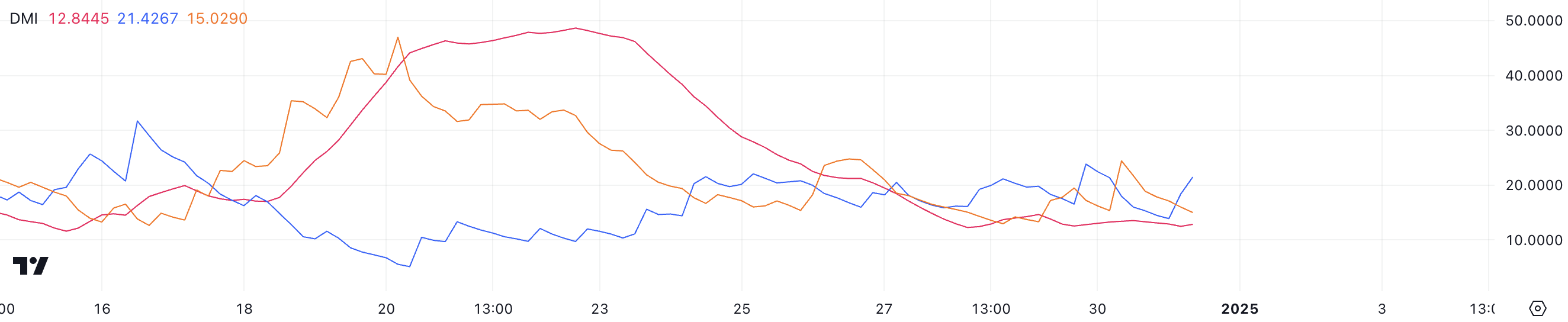 ETH DMI चार्ट इंगित करता है कि इसका ADX वर्तमान में 12.8 पर है, 27 दिसंबर से 20 से नीचे बना हुआ है। यह कम ADX रीडिंग सुझाव देती है कि ट्रेंड की ताकत कमजोर है, जो किसी भी दिशा में मजबूत मोमेंटम की कमी को दर्शाती है।