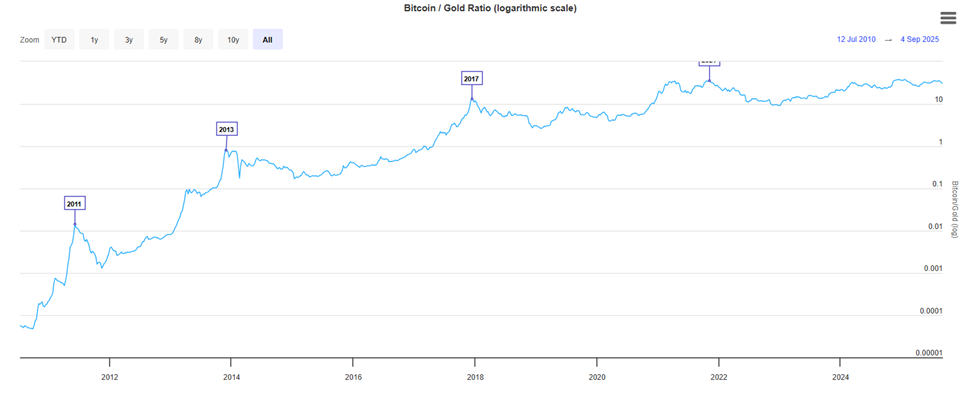 चार्ट 2010 से सोने के मुकाबले Bitcoin की वैल्यू को दिखाता है, जिसमें 2013, 2017, और 2021 में प्रमुख शिखर हैं, और 2025 तक सोने पर स्थिर अपवर्ड प्रभुत्व है।