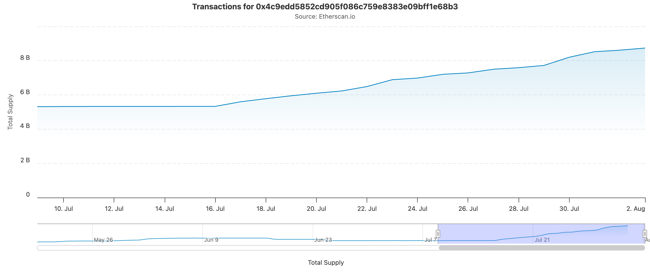 Etherscan के डेटा के अनुसार, USDe की सर्क्युलेटिंग सप्लाई $8.73 बिलियन के ऑल-टाइम हाई पर है, जो 16 जुलाई से $3.4 बिलियन से अधिक बढ़ी है।