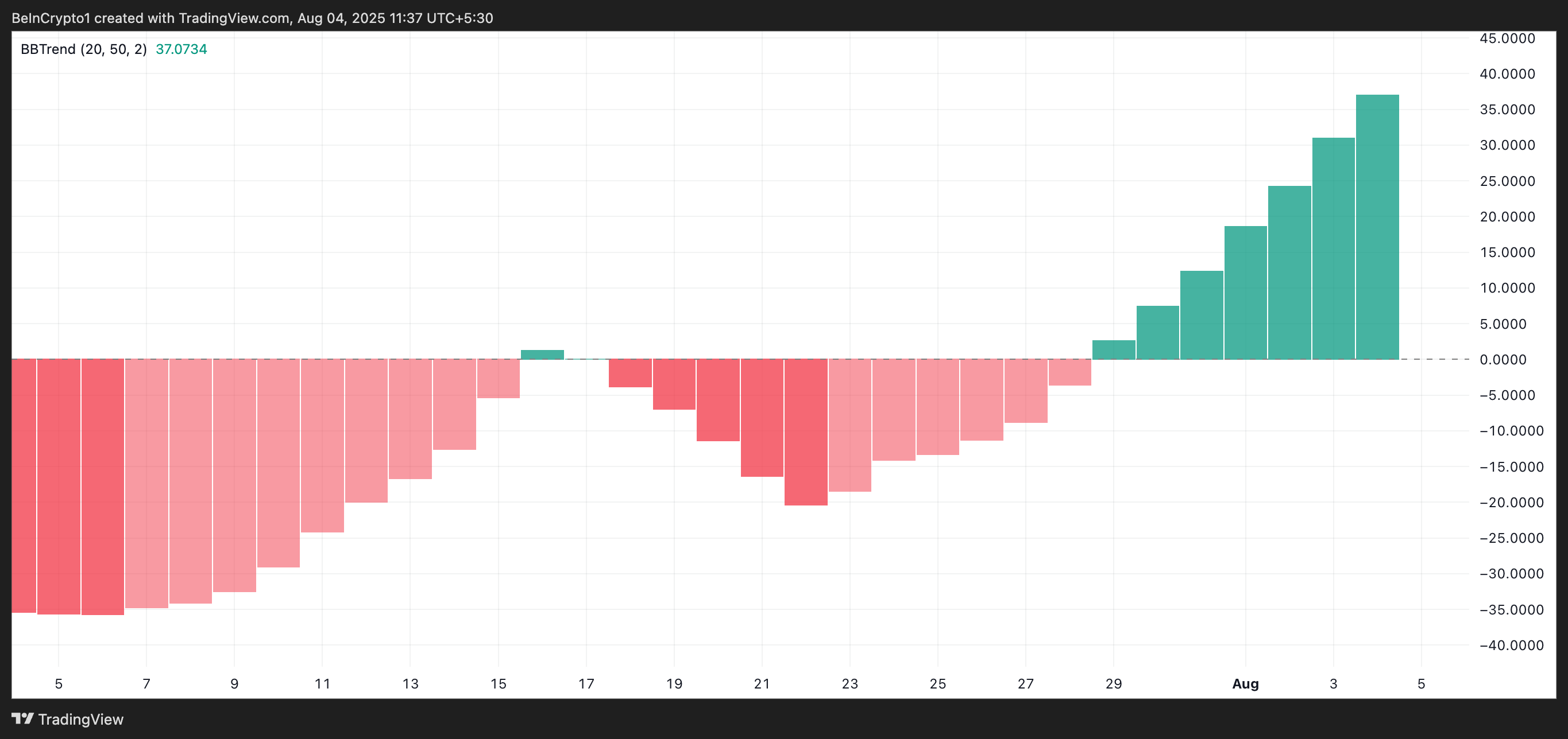 ENA/USD एक-दिवसीय चार्ट से तकनीकी रीडिंग्स से पता चलता है कि टोकन के BBTrend (Bollinger Band Trend) इंडिकेटर ने 29 जून से लगातार बढ़ते आकार की हरी बार्स प्रिंट की हैं।