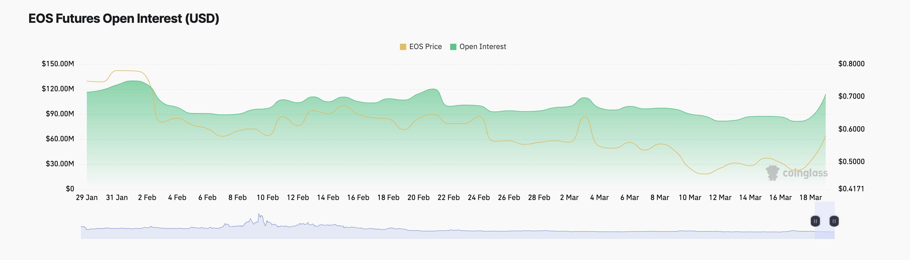 EOS की ओपन इंटरेस्ट (OI) में भी उछाल आया है, जो ट्रेडर के विश्वास में वृद्धि और अल्टकॉइन के चारों ओर गतिविधि में वृद्धि का संकेत देता है। इस लेखन के समय, OI $113 मिलियन है, जो पिछले 24 घंटों में 33% बढ़ा है।