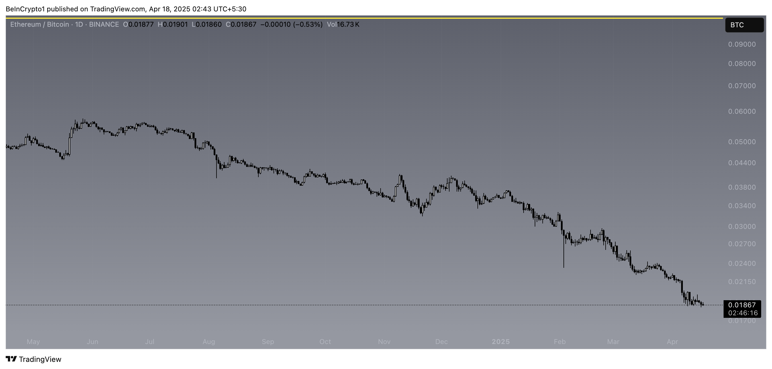 इस bearish भावना को और बढ़ाते हुए, ETH/BTC अनुपात पांच साल के निचले स्तर पर पहुंच गया है, जो Bitcoin की Ethereum पर बढ़ती प्रभुत्व को दर्शाता है।