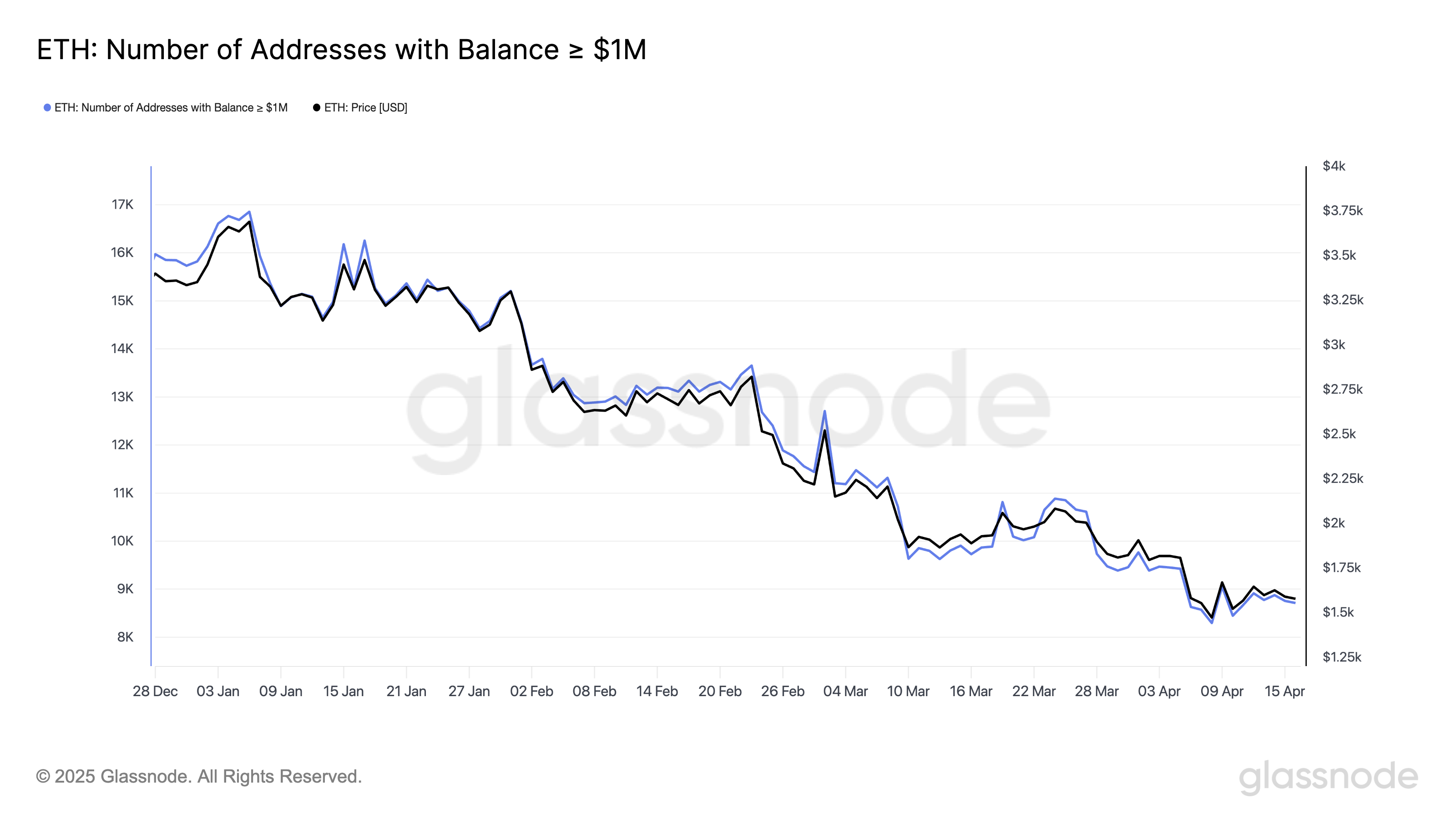 इस बीच, बड़े Ethereum धारक तेजी से बड़ी मात्रा में सेल-ऑफ़ कर रहे हैं, जिससे उनकी कीमतों पर दबाव पड़ रहा है। Ethereum का मूल्य 2025 की शुरुआत से 51.3% तक गिर चुका है, और निवेशकों का विश्वास कम हो गया है, जैसा कि कम से कम $1 मिलियन ETH रखने वाले पतों की संख्या में कमी से स्पष्ट है।