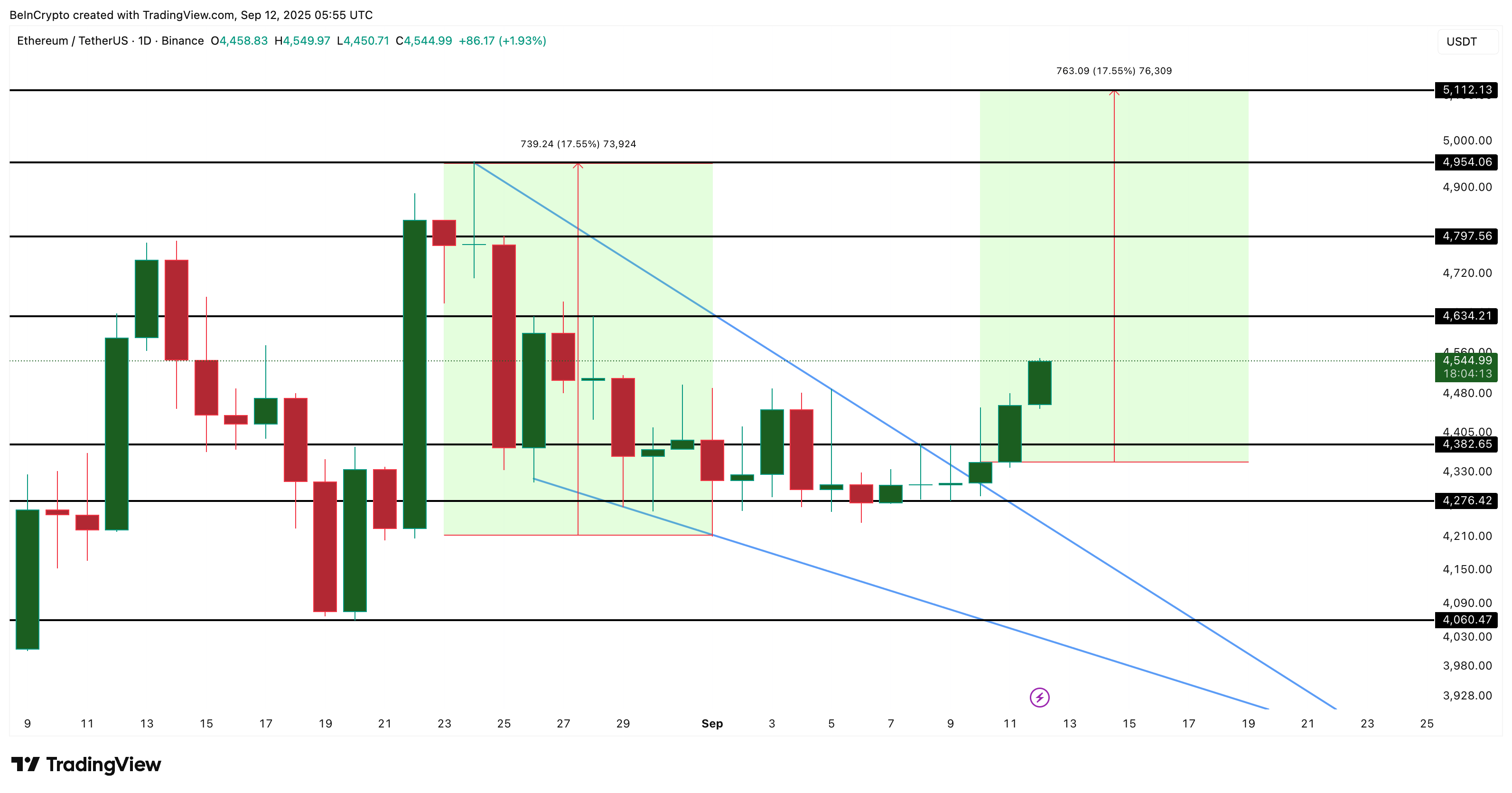 Ethereum $4,540 से ऊपर ट्रेड कर रहा है, 12 सितंबर को प्रेस समय पर, पिछले 24 घंटों में लगभग 3% की वृद्धि के साथ। साप्ताहिक लाभ लगभग 4.7% पर है, जबकि महीने-दर-महीने परिवर्तन –1.9% पर स्थिर हैं। फिर भी, 10 सितंबर को हुआ ब्रेकआउट ने Ethereum प्राइस को फिर से सुर्खियों में ला दिया है।