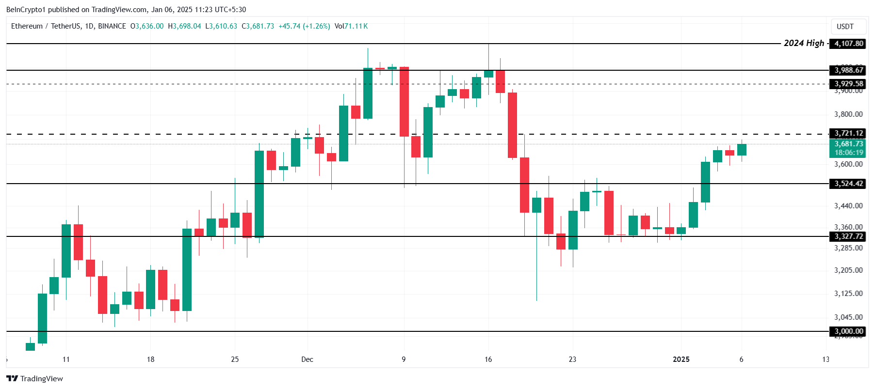 Ethereum वर्तमान में $3,681 पर ट्रेड कर रहा है, जो $3,721 के रेजिस्टेंस से थोड़ा नीचे है, एक महत्वपूर्ण रेजिस्टेंस पॉइंट और अंतिम बाधा है इससे पहले कि Ethereum $4,000 तक पहुंचे। इस स्तर को सपोर्ट में बदलने से $4,107 के 2024 हाई तक पहुंचने का मंच तैयार होगा।