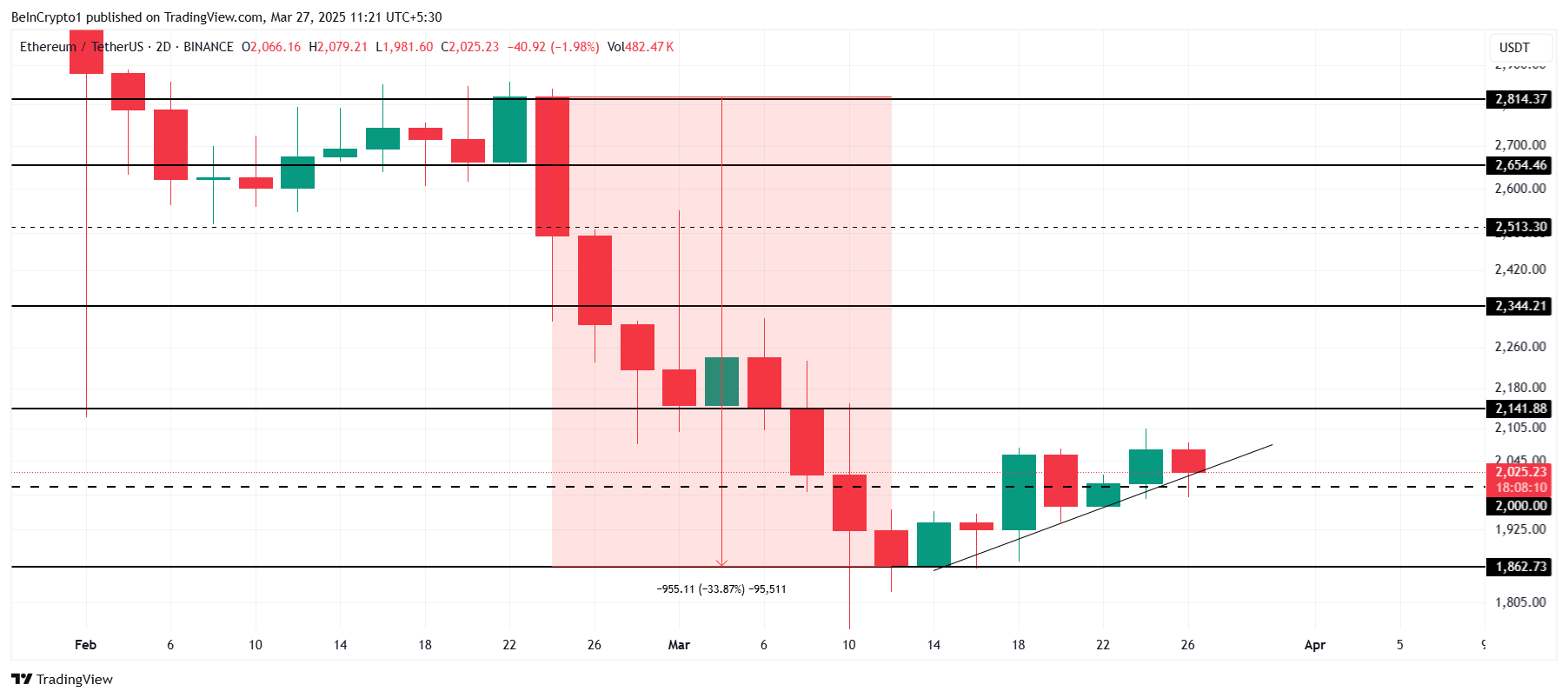 यदि Ethereum सफलतापूर्वक $2,141 को समर्थन के रूप में सुरक्षित कर लेता है, तो यह फरवरी के अंत से 33% की गिरावट को पुनः प्राप्त करने की राह पर हो सकता है। इस प्रतिरोध के ऊपर एक स्थायी ब्रेक ETH को $2,344 की ओर धकेल सकता है, जिससे खोई हुई जमीन को पुनः प्राप्त करने और बुलिश ट्रेंड को जारी रखने में मदद मिलेगी। यह Ethereum के बाजार दृष्टिकोण में नए सिरे से विश्वास का संकेत देगा।