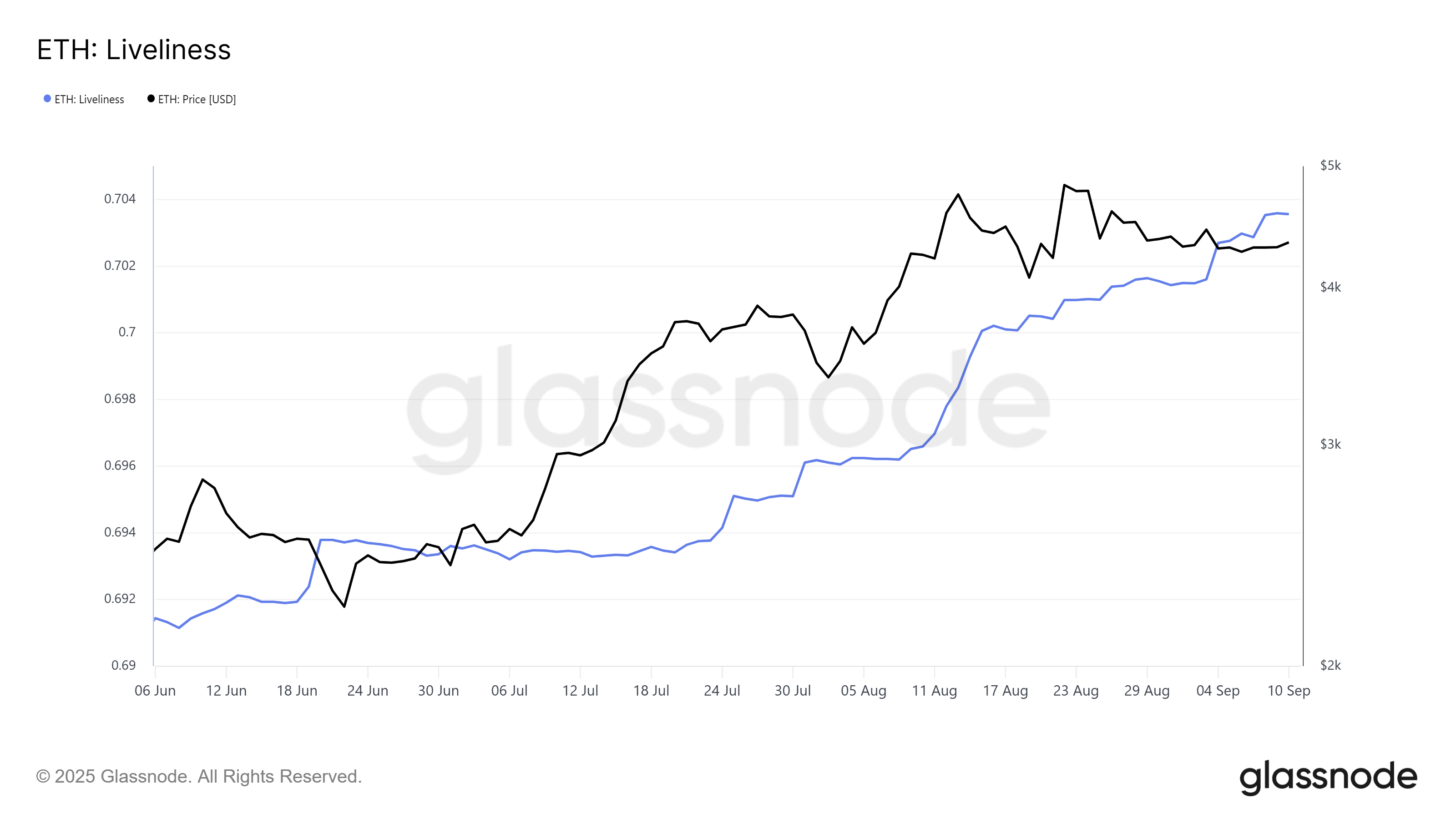 Liveliness इंडिकेटर भी सतर्कता का संकेत दे रहा है। इस मेट्रिक में वृद्धि लॉन्ग-टर्म होल्डर्स के अपने ETH बेचने का संकेत देती है, बजाय इसके कि वे इसे जमा करें। यह बदलाव आमतौर पर तब उभरता है जब होल्डर्स संभावित नुकसान से डरते हैं या सीमित अपवर्ड की उम्मीद करते हैं। उनके कार्य मार्केट की स्थिरता पर दबाव डालते हैं।
