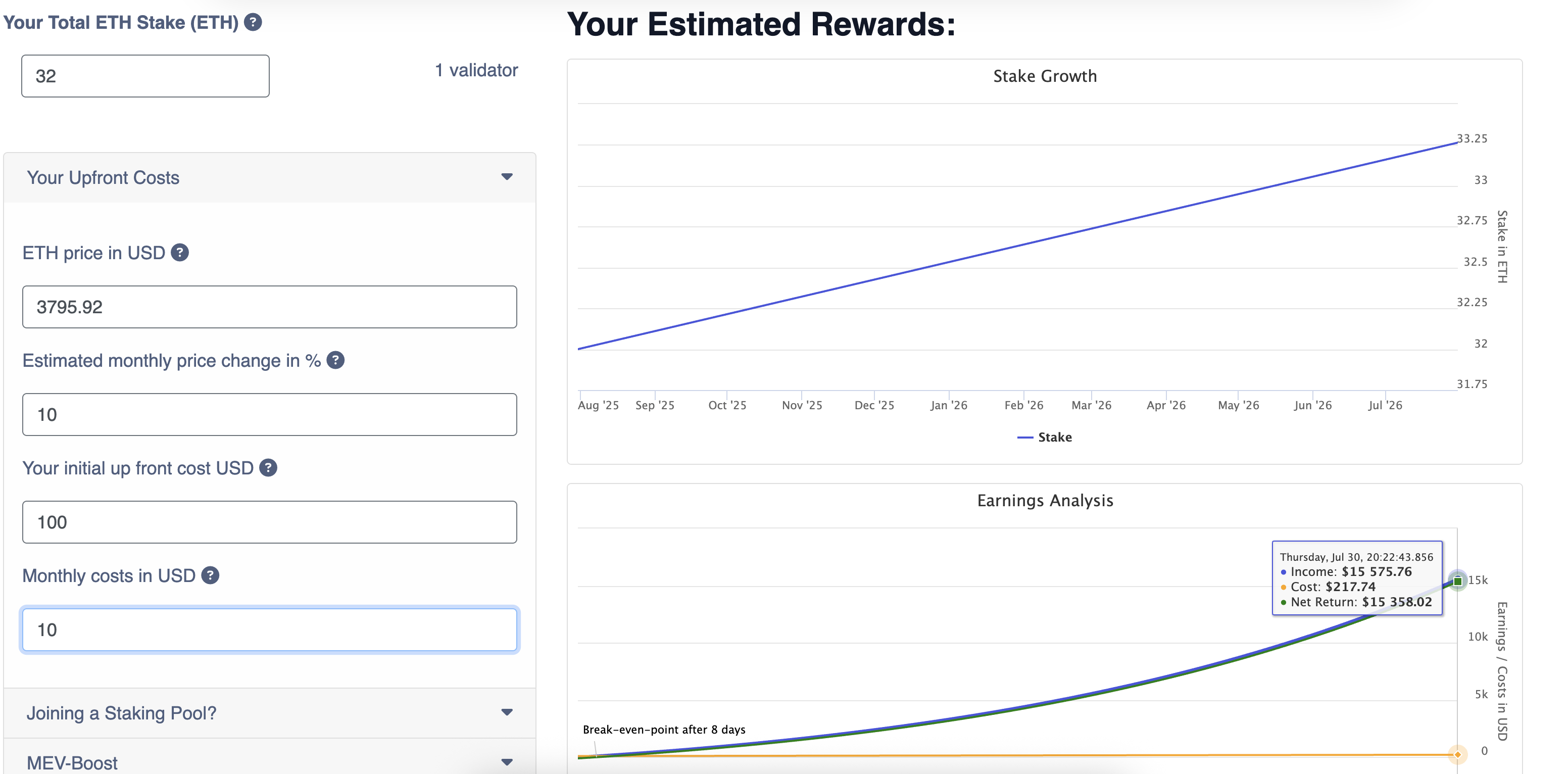 हालांकि नेटवर्क को एक सोलो वेलिडेटर चलाने के लिए 32 ETH की आवश्यकता होती है, जो इस मार्ग को बड़े होल्डर्स तक सीमित रखता है, फिर भी रिवॉर्ड्स आकर्षक बने हुए हैं। एक स्टैंडर्ड वेलिडेटर एक साल में लगभग $15,358 का नेट रिटर्न कमा सकता है, यह मानते हुए कि वर्तमान ETH की कीमत $3,795 है और औसत वृद्धि दरें हैं।