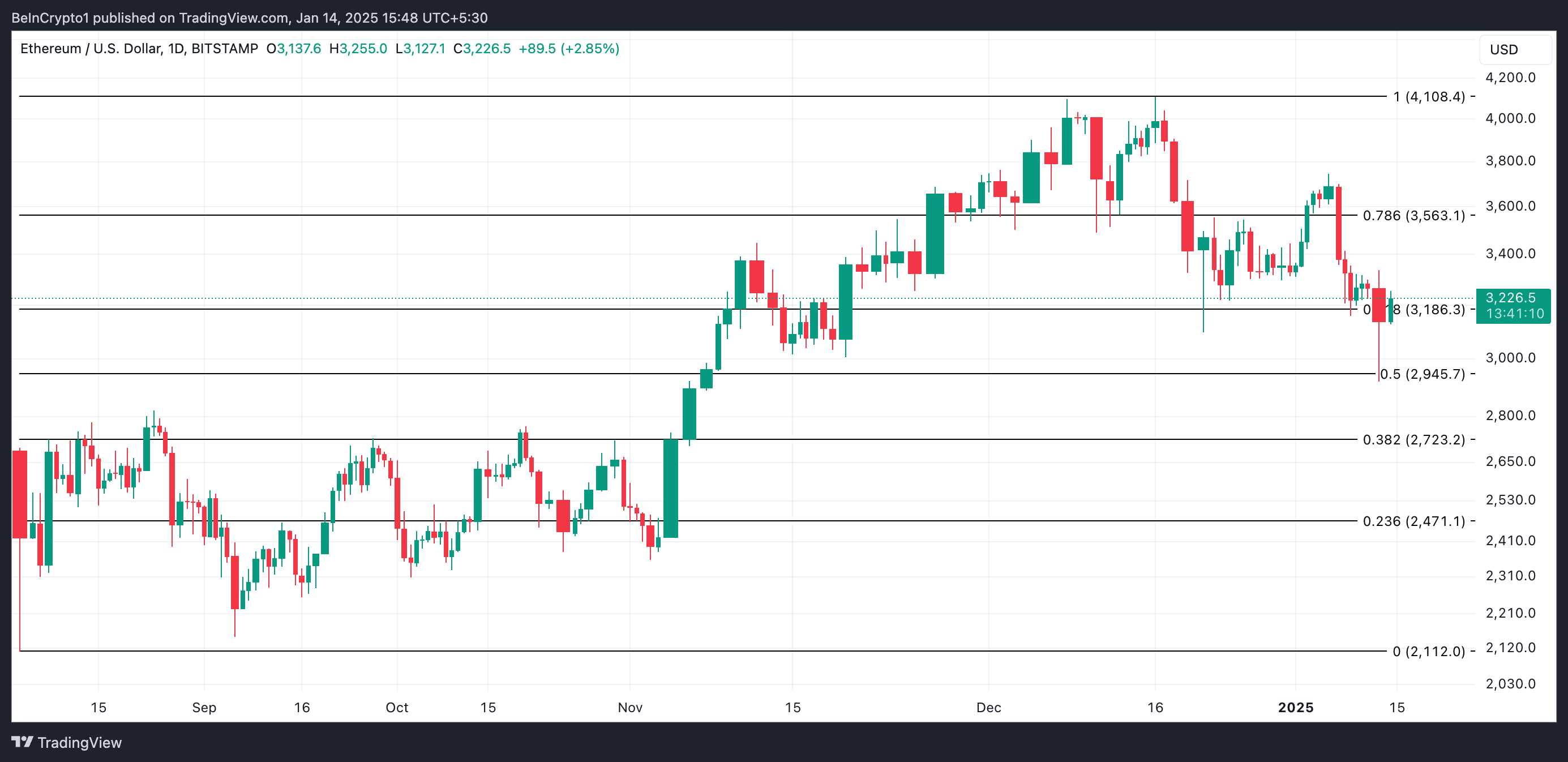 इस लेखन के समय, ETH $3,226 पर ट्रेड कर रहा है, जो $3,186 के सपोर्ट लेवल से थोड़ा ऊपर है। अगर व्यापक बाजार की भावना में सुधार होता है और ETH का एकत्रीकरण बढ़ता है, तो इसकी कीमत $3,563 की ओर बढ़ सकती है।