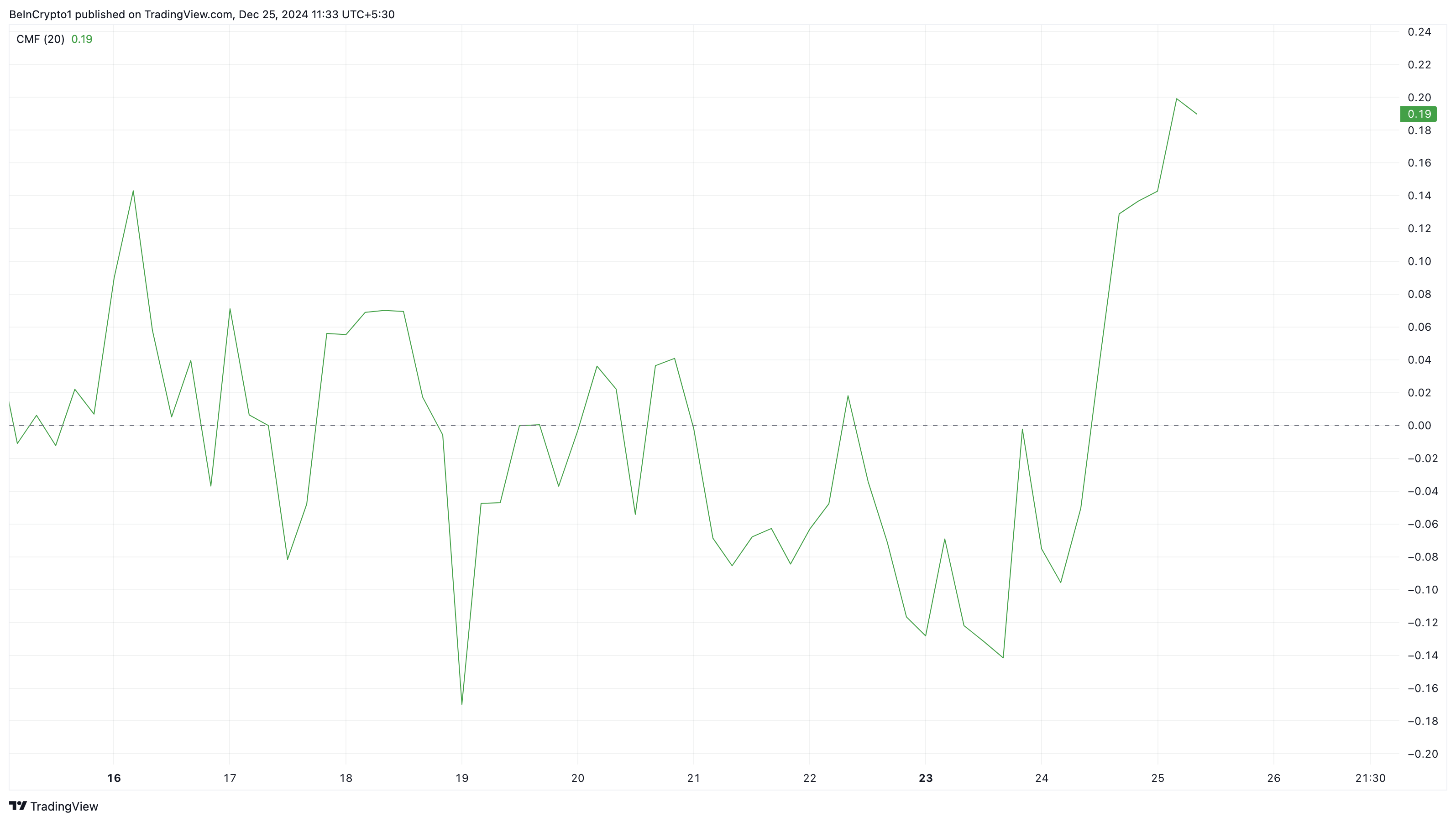 इसके अलावा, Chaikin Money Flow (CMF) ने खुलासा किया कि मीम कॉइन के आसपास की सकारात्मक भावना के कारण मांग भी बढ़ गई। CMF क्रिप्टोकरेंसी में या बाहर पैसे के प्रवाह को मापता है, जिससे संचय (खरीदारी) और वितरण (बेचने) के स्तर की पहचान करने में मदद मिलती है।