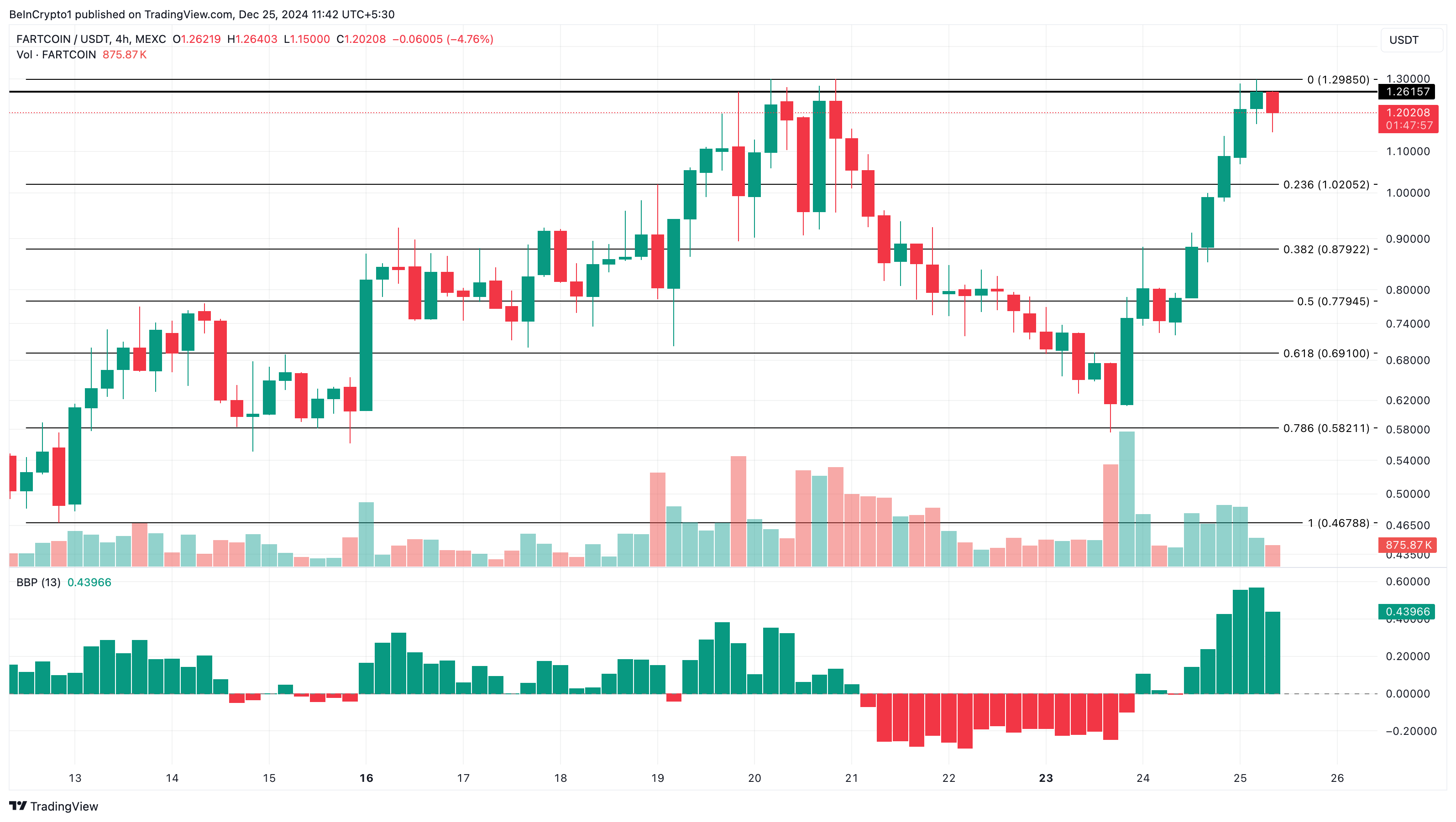 इस बीच, 4-घंटे के टाइमफ्रेम पर नज़र डालने से पता चलता है कि FARTCOIN को $1.25 पर रेजिस्टेंस का सामना करना पड़ा। इस बाधा को पार करने में असमर्थता ने कीमत को $1.20 पर वापस खींच लिया।