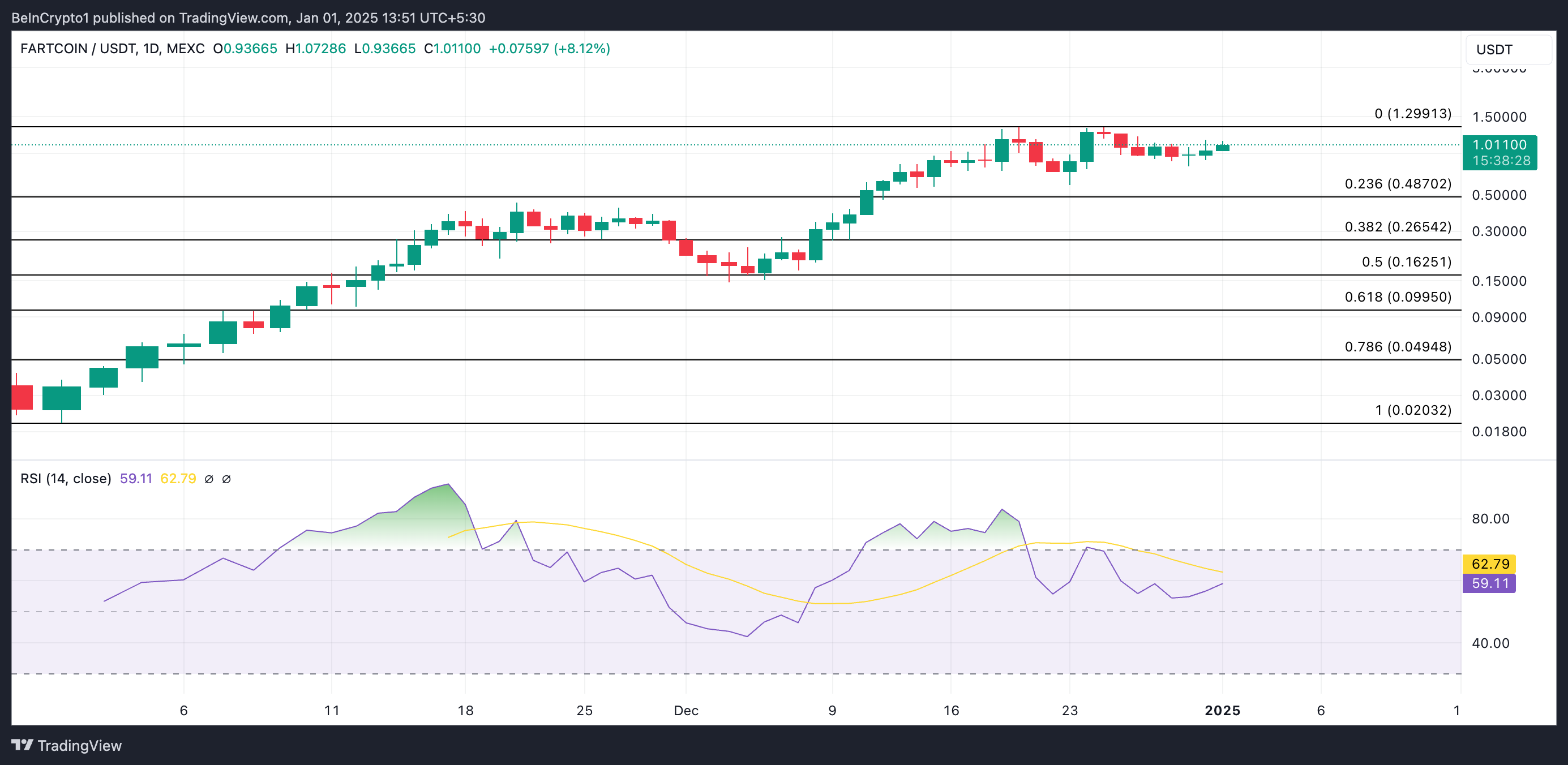 इस लेखन के समय, FARTCOIN $1.01 पर ट्रेड कर रहा है। एक दैनिक चार्ट पर, इसका रिलेटिव स्ट्रेंथ इंडेक्स (RSI), जो इसके ओवरबॉट और ओवरसोल्ड मार्केट कंडीशन्स को मापता है, 59.11 पर अपवर्ड ट्रेंड में है, जो मीम कॉइन की स्थिर मांग की पुष्टि करता है।