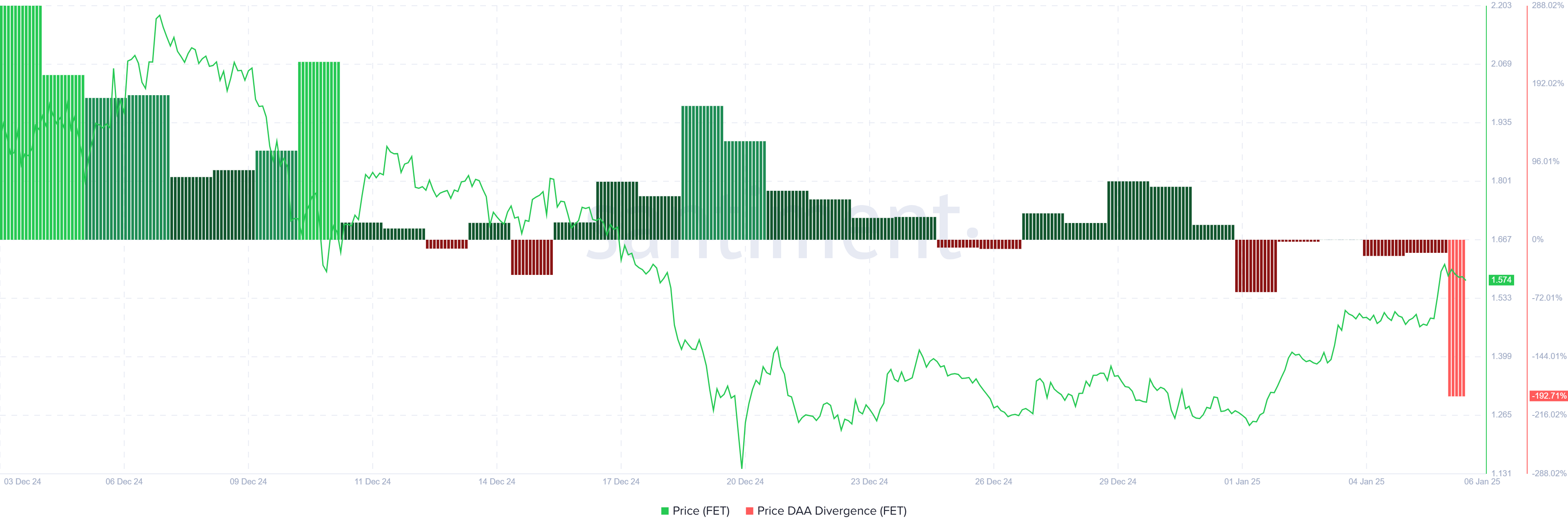 प्राइस DAA डाइवर्जेंस वर्तमान में FET के लिए एक सेल सिग्नल दिखा रहा है, जिससे स्थिरता के बारे में चिंताएं बढ़ रही हैं। बढ़ती कीमतें नेटवर्क की घटती गतिविधि से अलग हो रही हैं, जिससे एक असंगति उत्पन्न हो रही है जो अक्सर सुधार की ओर ले जाती है। ऐतिहासिक रूप से, इसी तरह की स्थितियों ने प्राइस ड्रॉप्स को प्रेरित किया है, जो संभावित रूप से निवेशकों के उत्साह को पुनर्निर्देशित कर सकता है।