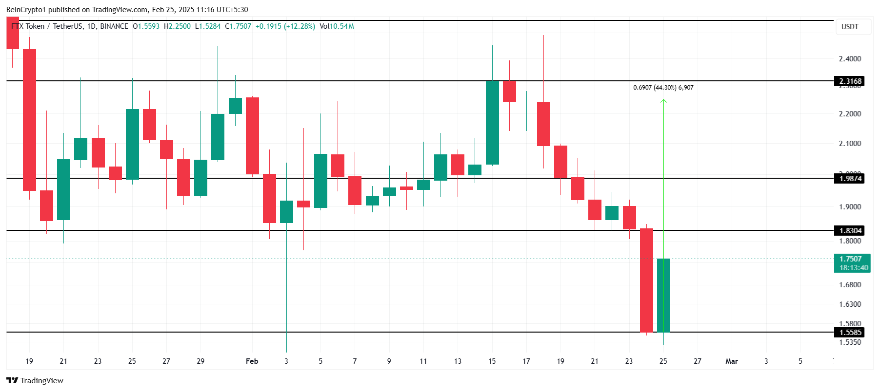 FTT की तेज़ी से 44% की वृद्धि ने कीमत को $2.31 के उच्च स्तर तक पहुंचा दिया, फिर यह $1.75 पर वापस आ गई। इसके बावजूद, यह हफ्ते की शुरुआत में देखी गई 32% की गिरावट से कुछ हद तक उबरने में सफल रहा है। हालांकि, टोकन अभी भी $1.83 के प्रतिरोध से ऊपर जाने के लिए संघर्ष कर रहा है।