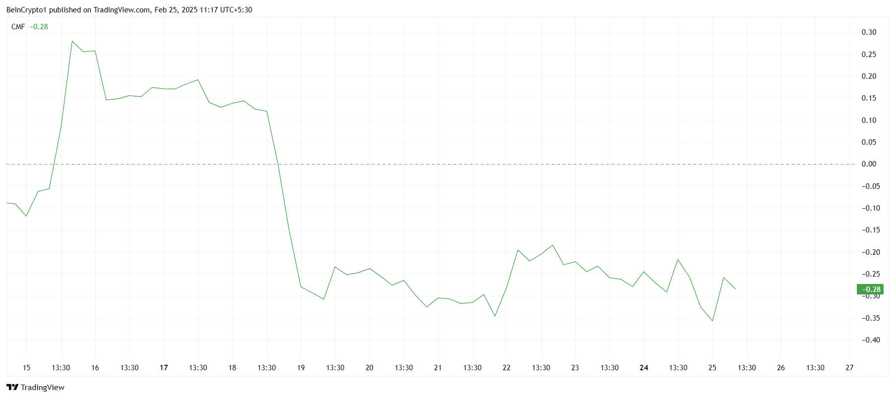 हालांकि कीमत में उछाल आया, Chaikin Money Flow (CMF) इंडिकेटर ने दिखाया कि यह वृद्धि पर्याप्त पूंजी प्रवाह द्वारा समर्थित नहीं थी। इसके बजाय, यह SBF और FTX स्थिति के इर्द-गिर्द भावना से प्रेरित थी। CMF ने खरीदारी की मात्रा में कोई संबंधित वृद्धि नहीं दिखाई, जो इंगित करता है कि कीमत में वृद्धि सट्टा थी और टिकाऊ नहीं थी।