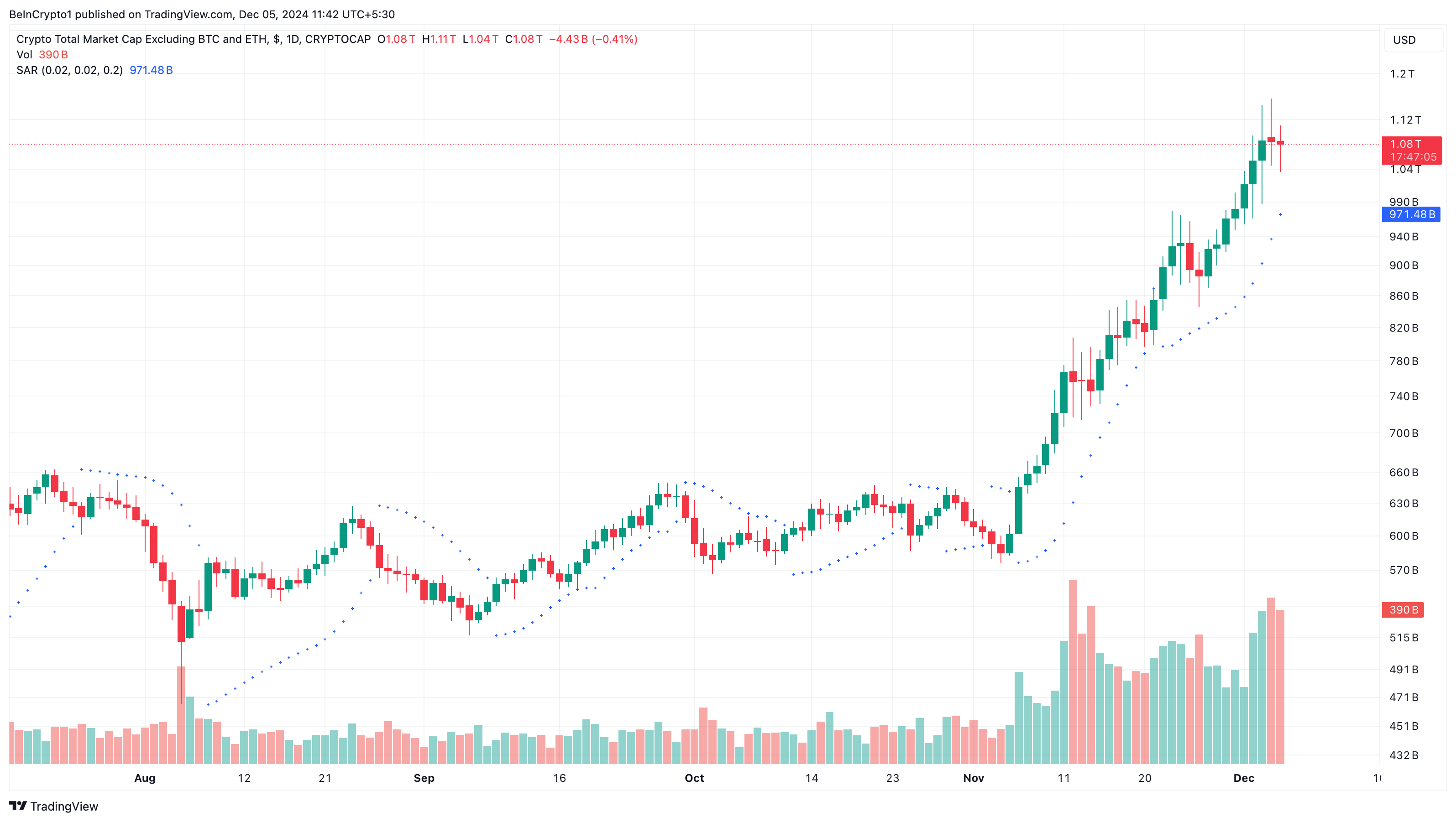 वर्तमान में, TOTAL3 $1.08 ट्रिलियन तक पहुंच गया है, जो व्यापक altcoin मार्केट में मजबूती का संकेत देता है। इसके अतिरिक्त, Parabolic Stop and Reverse (SAR) इंडिकेटर, जो समर्थन या प्रतिरोध स्तरों की पहचान करने के लिए एक उपकरण है, बाजार मूल्य के नीचे स्थित है।