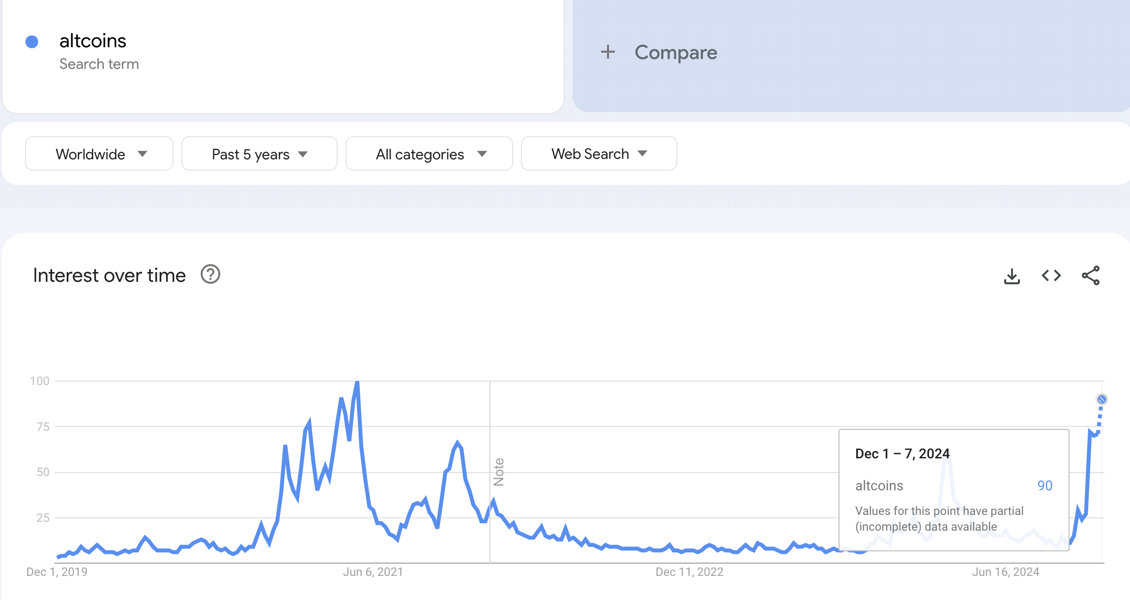 दूसरी ओर, 100 के करीब Google Trends स्कोर किसी शब्द के लिए चरम खोज रुचि को दर्शाता है। वर्तमान में, ‘अल्टकॉइन’ के लिए विश्वव्यापी खोज का स्कोर 90 है, जो इन क्रिप्टोकरेंसी में अत्यधिक रुचि को दर्शाता है।