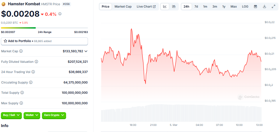 हालांकि, नेटवर्क के प्रदर्शन मेट्रिक्स की घोषणा के बावजूद, Hamster Kombat टोकन की कीमत 0.5% गिर गई है। CoinGecko के अनुसार, यह लेख लिखे जाने के समय HMSTR टोकन $0.00208 पर ट्रेड कर रहा था।