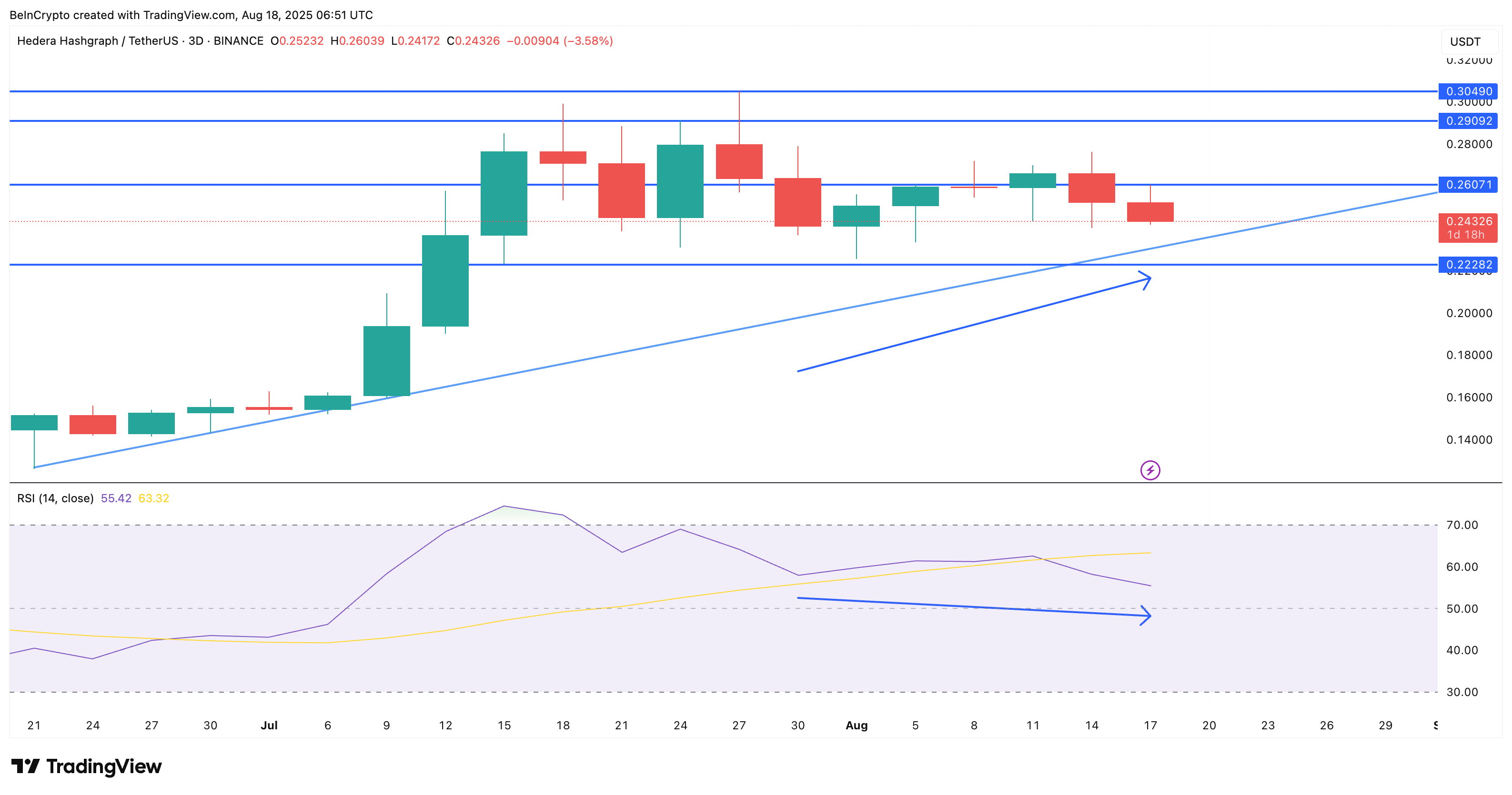 दूसरा, एक छिपा हुआ बुलिश RSI डाइवर्जेंस बन रहा है। 30 जुलाई से 17 अगस्त के बीच, HBAR प्राइस ने उच्च निचले स्तर बनाए हैं, जबकि 3-दिवसीय RSI ने निचले स्तर बनाए हैं। यह एक क्लासिक मामला है जहां मोमेंटम रीसेट हो रहा है जबकि प्राइस ट्रेंड संरचना बनाए रखता है, जो अक्सर संकेत देता है कि विक्रेता पकड़ खो रहे हैं।