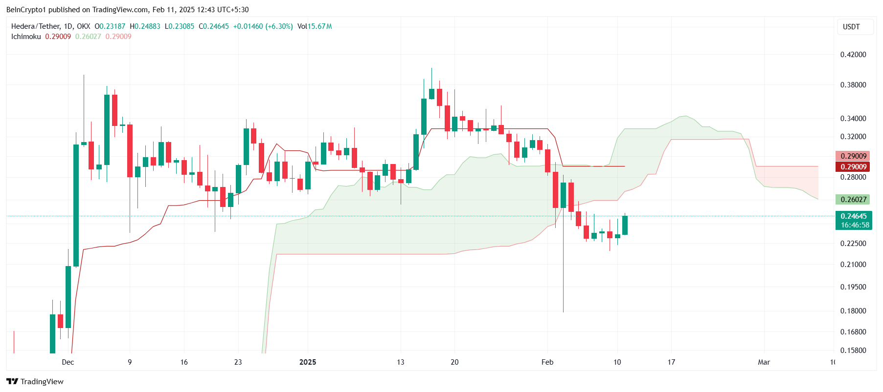 HBAR का कुल मैक्रो मोमेंटम संभावित बुलिशनेस के संकेत दिखा रहा है, जैसा कि तकनीकी इंडिकेटर्स जैसे कि Ichimoku Cloud द्वारा सुझाया गया है। इंडिकेटर का आउटलुक आने वाले हफ्तों में संभावित अपसाइड मूवमेंट की ओर इशारा करता है। हालांकि, कैंडलस्टिक्स वर्तमान में क्लाउड के नीचे स्थित हैं, जो संकेत देता है कि कोई भी रिकवरी में देरी हो सकती है।