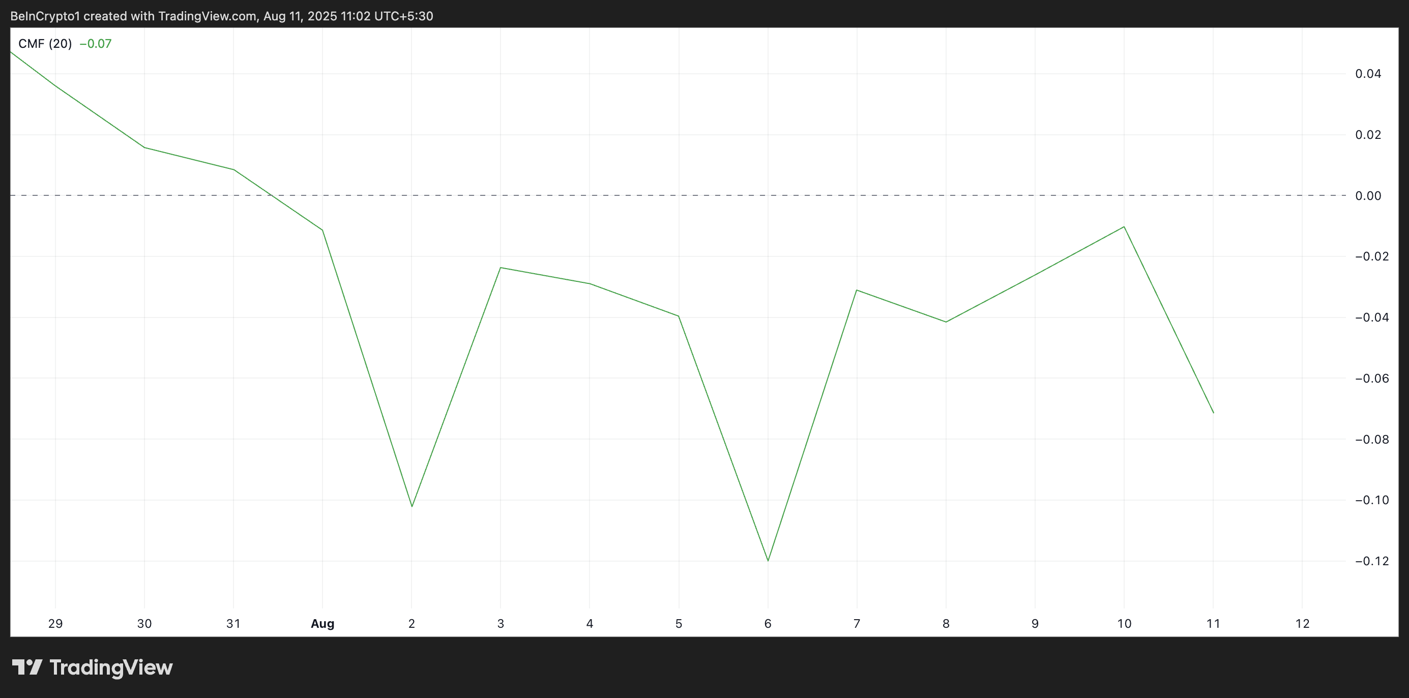 जब CMF पॉजिटिव होता है, तो खरीदारी का दबाव मजबूत होता है, और अधिक पैसा एसेट में आ रहा होता है। इसके विपरीत, जब इसका मूल्य नकारात्मक होता है, तो बिक्री का दबाव हावी होता है।