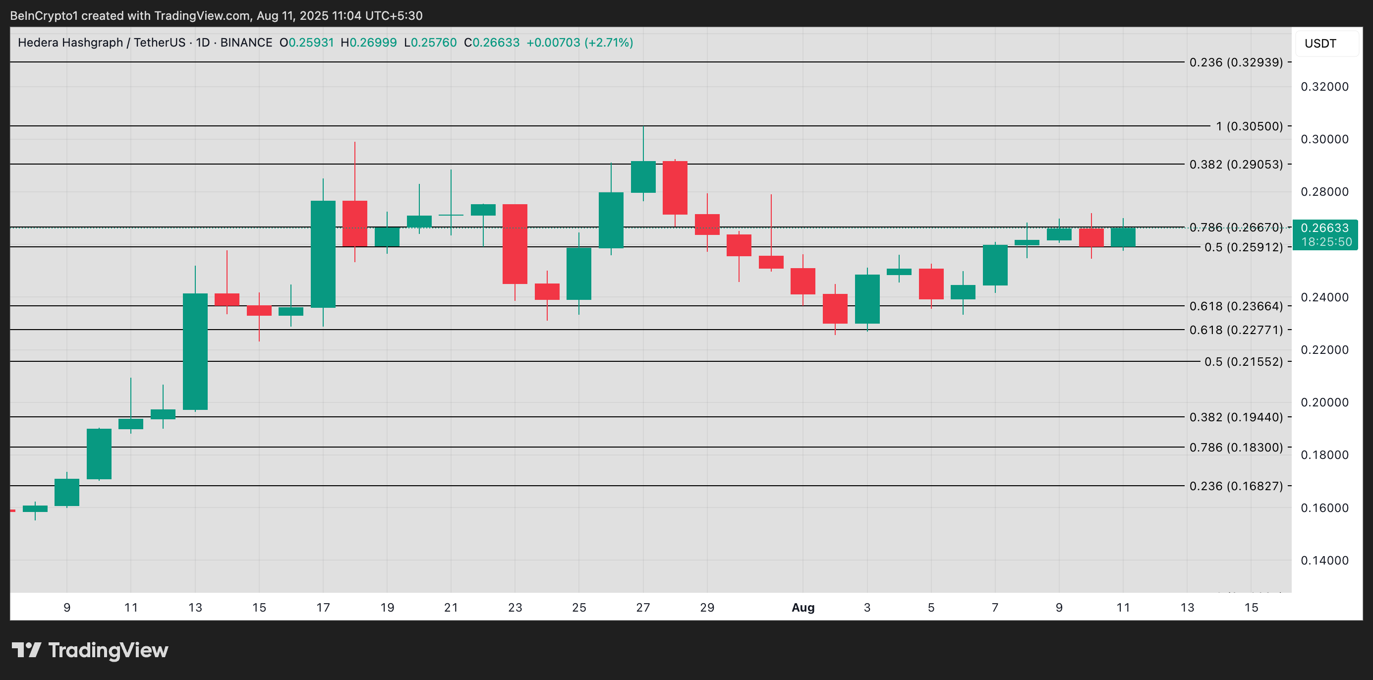 प्रेस समय में, HBAR $0.2663 पर ट्रेड कर रहा है, जो क्षैतिज चैनल की ऊपरी रेखा के नीचे है, जो $0.2667 पर प्रतिरोध बनाता है।