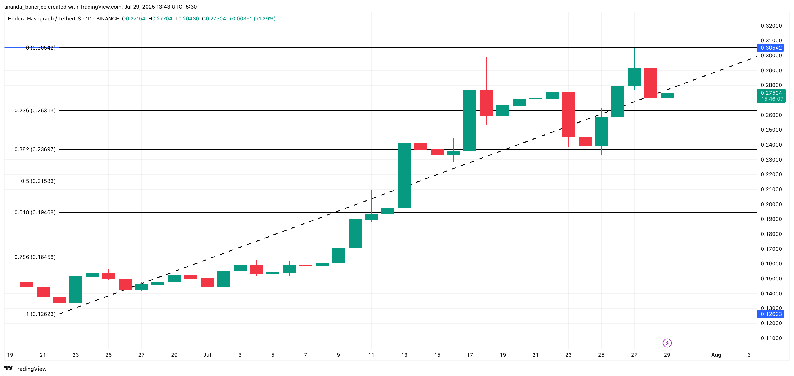 छोटे स्विंग चार्ट के अनुसार, $0.28 HBAR के लिए एक प्रमुख स्तर बना हुआ है जिसे तोड़ना होगा। और $0.26 स्तर मुख्य समर्थन के रूप में कार्य करता है, जो बड़े स्विंग या प्राथमिक चार्ट के साथ संरेखित होता है।