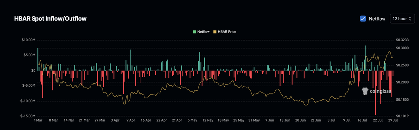 स्पॉट नेटफ्लो चार्ट से पता चलता है कि जुलाई में, एक्सचेंजों ने मुख्य रूप से HBAR के ऑउटफ्लो देखे हैं, जो बढ़ते कंसोलिडेशन का संकेत देते हैं।
