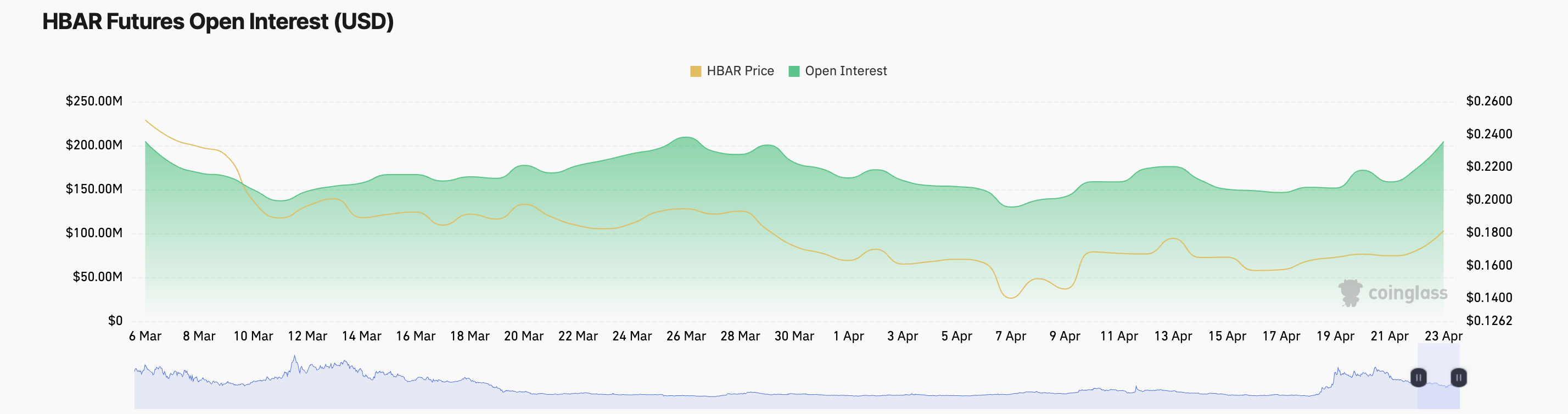 ओपन इंटरेस्ट उन सभी फ्यूचर्स कॉन्ट्रैक्ट्स की कुल संख्या को संदर्भित करता है जो अभी तक सेटल नहीं हुए हैं। जब ओपन इंटरेस्ट इस तरह से कीमत के साथ बढ़ता है, तो यह इंगित करता है कि बाजार में अपट्रेंड को समर्थन देने के लिए नया पैसा आ रहा है। यह ट्रेंड HBAR के अपवर्ड मूवमेंट के पीछे मजबूत विश्वास का संकेत देता है।