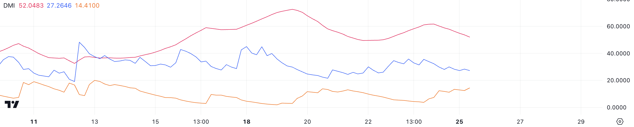 Hedera DMI चार्ट एक ADX मूल्य 52 को हाइलाइट करता है, जो एक मजबूत मार्केट ट्रेंड का संकेत देता है। ADX, या एवरेज डायरेक्शनल इंडेक्स, एक ट्रेंड की ताकत को मापता है, जिसमें 25 से ऊपर के मूल्य एक महत्वपूर्ण ट्रेंड और 40 से ऊपर के मूल्य एक अत्यधिक मजबूत ट्रेंड का संकेत देते हैं।