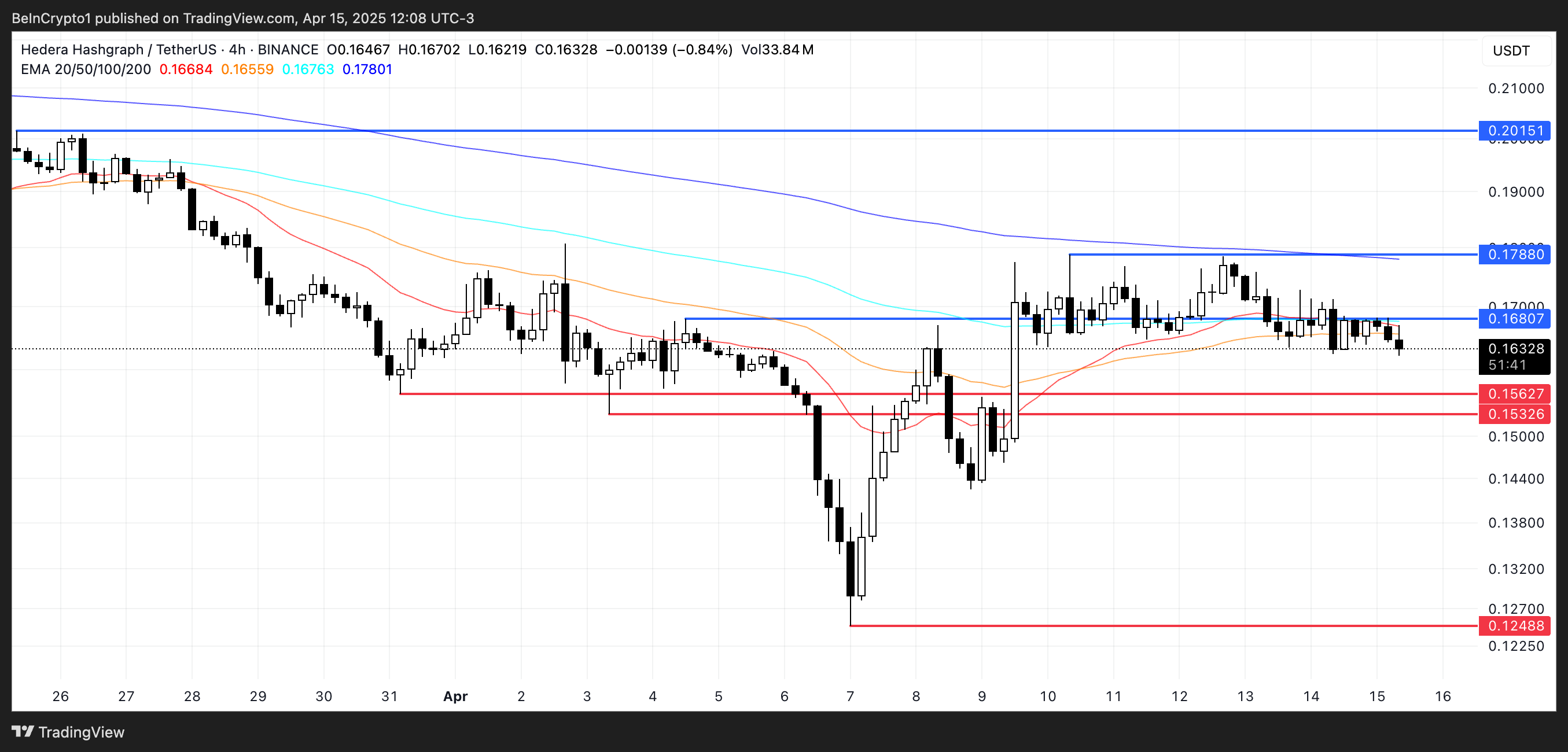 Hedera की EMA लाइन्स संभावित डेथ क्रॉस का संकेत दे रही हैं, जो एक bearish फॉर्मेशन है जो डाउनसाइड प्रेशर को बढ़ा सकता है। यदि यह पैटर्न कन्फर्म होता है, तो Hedera की कीमत पहले $0.156 और $0.153 के दो नजदीकी सपोर्ट लेवल्स का परीक्षण कर सकती है।