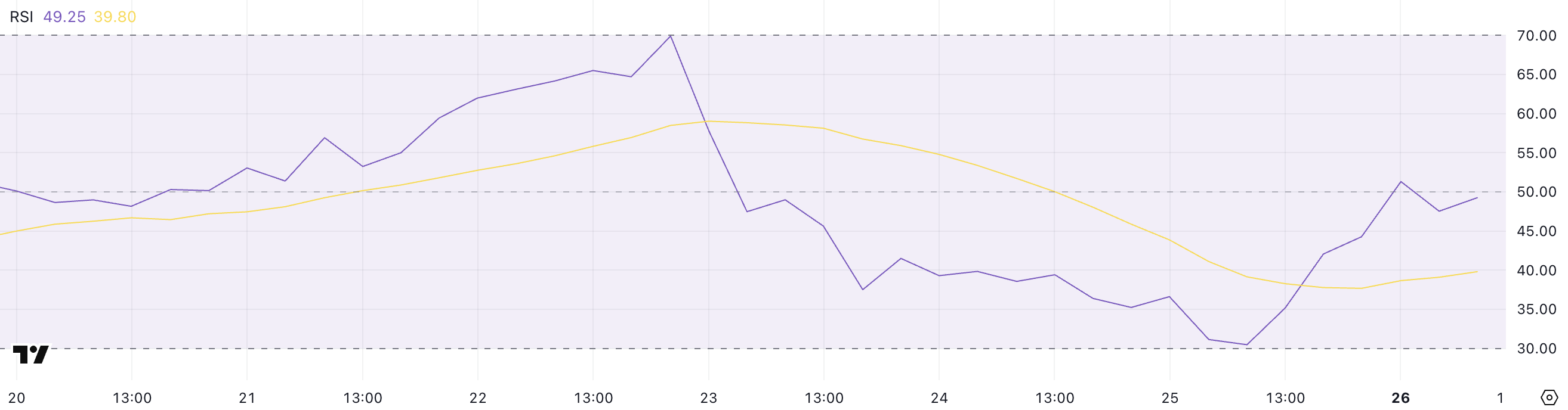 Hedera Relative Strength Index (RSI) वर्तमान में 49.25 पर है, जो एक दिन पहले 30.46 के निचले स्तर से रिकवर हो रहा है।