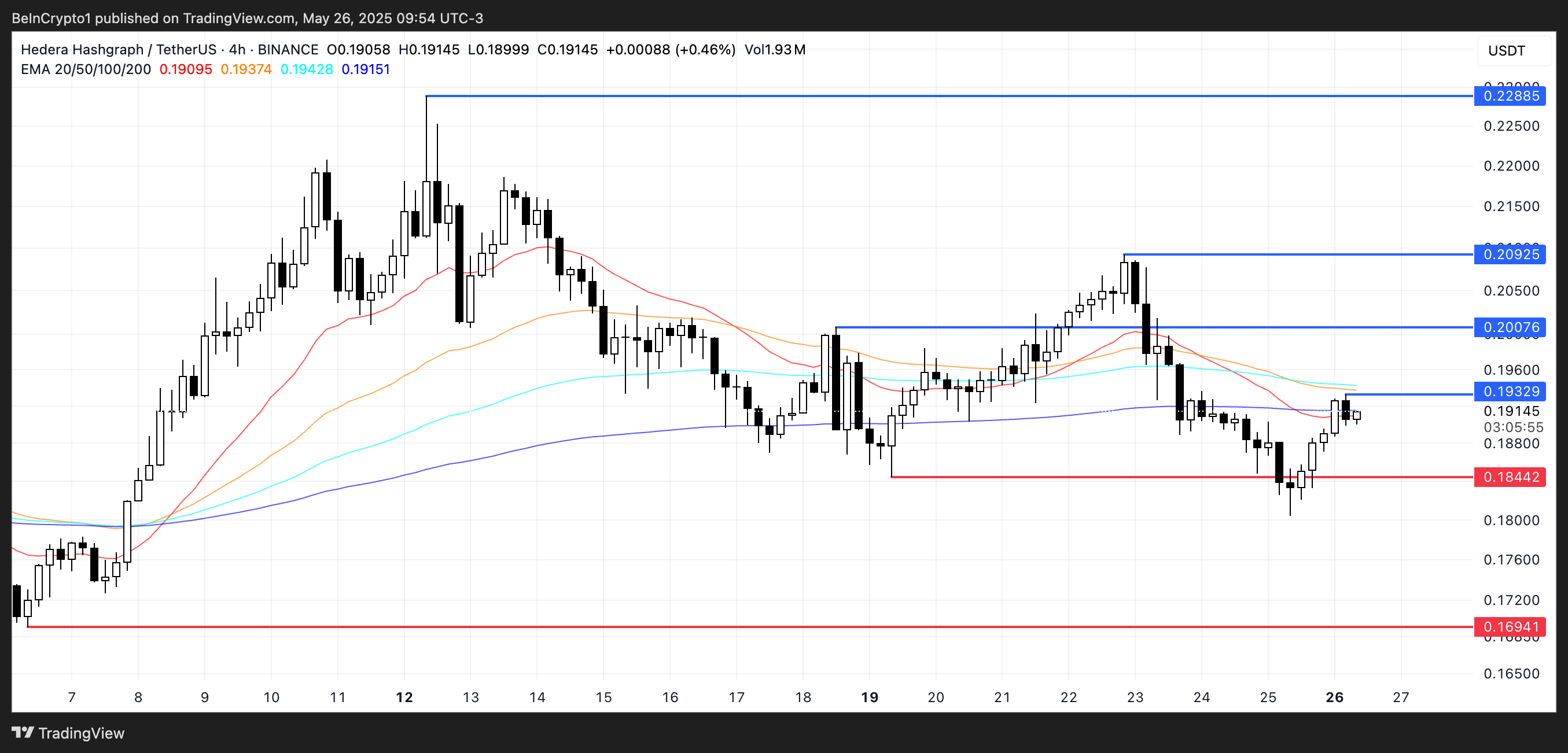अगर बुलिश मोमेंटम लौटता है, तो Hedera की कीमत $0.193 रेजिस्टेंस लेवल को पार कर सकती है, $0.20 की ओर रास्ता खोलते हुए।