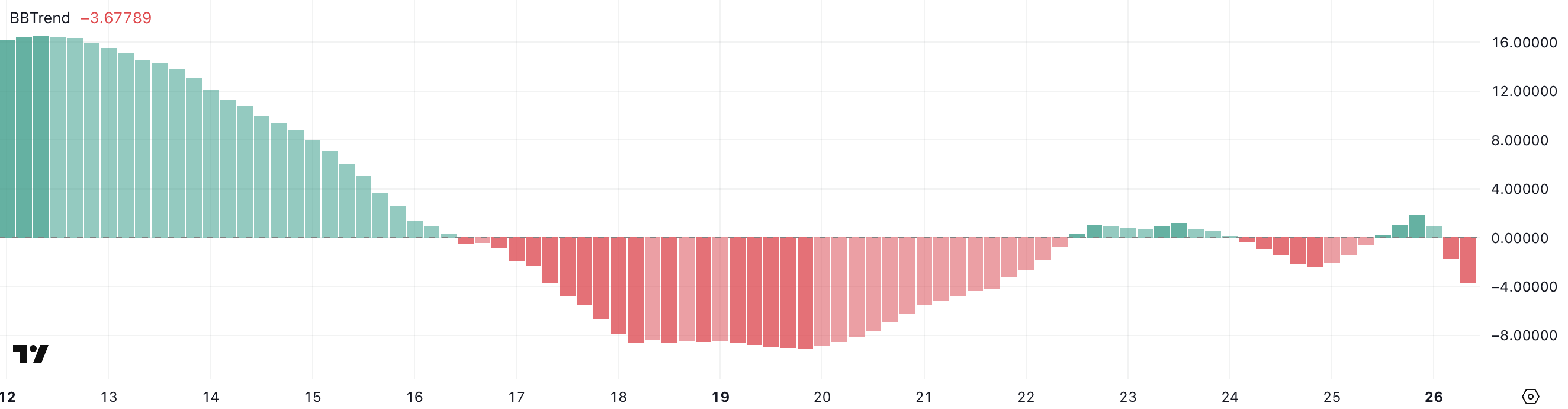 BBTrend, या Bollinger Band Trend, Bollinger Bands के सापेक्ष प्राइस मूवमेंट की ताकत और दिशा को मापता है। +2 से ऊपर के मान आमतौर पर मजबूत बुलिश मोमेंटम को इंगित करते हैं, जबकि -2 से नीचे के मान मजबूत bearish ट्रेंड्स को दर्शाते हैं।
