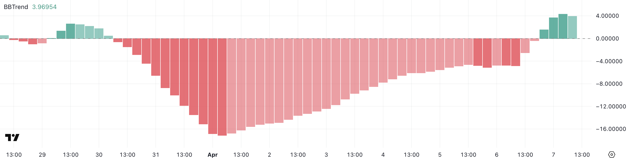 Hedera का BBTrend इंडिकेटर सकारात्मक हो गया है, जो वर्तमान में 3.96 पर है, जबकि पिछले सात दिनों में यह नकारात्मक क्षेत्र में था और 1 अप्रैल को -17.12 के निचले स्तर पर पहुंच गया था।