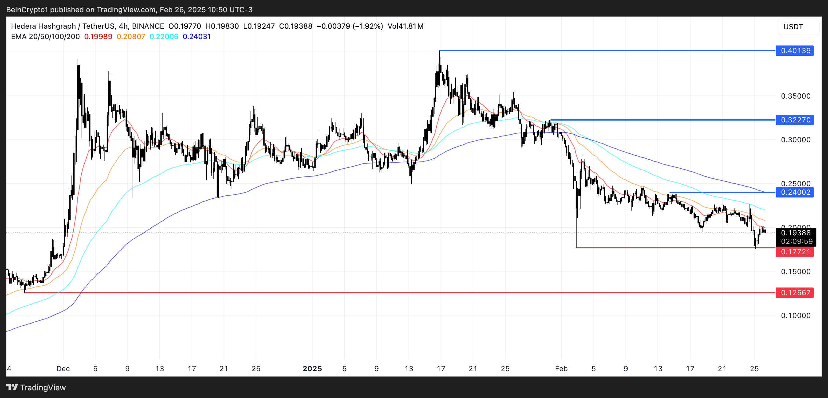 HBAR की EMA लाइन्स वर्तमान में एक bearish ट्रेंड का संकेत दे रही हैं, जिसमें शॉर्ट-टर्म EMAs लॉन्ग-टर्म EMAs के नीचे स्थित हैं। यह संरेखण इंगित करता है कि डाउनवर्ड मोमेंटम प्रबल है, और सेलिंग प्रेशर प्रमुख बना हुआ है।