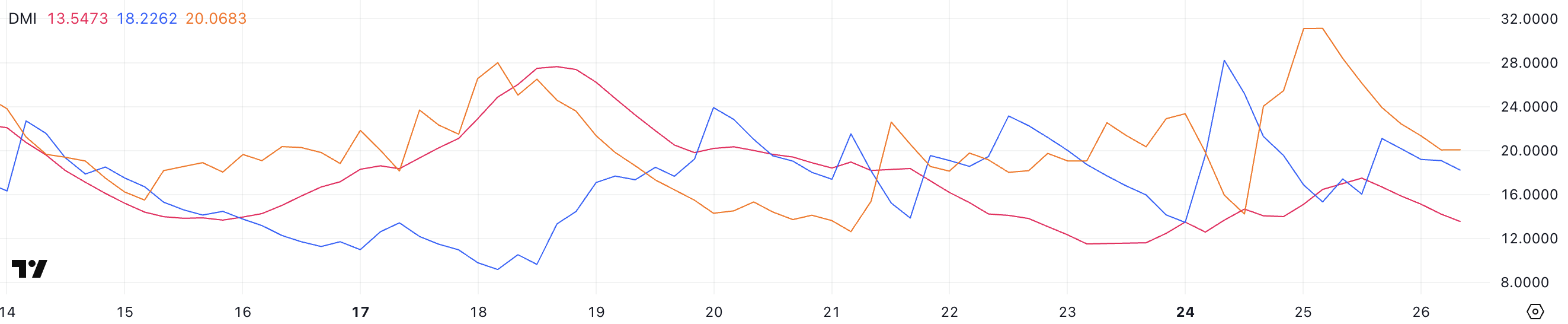 HBAR का Directional Movement Index (DMI) दिखाता है कि इसका ADX वर्तमान में 13.5 पर है, जो कल 17.4 था। Average Directional Index (ADX) ट्रेंड की स्ट्रेंथ को मापता है, दिशा की परवाह किए बिना, और 20 से नीचे के मूल्य आमतौर पर एक कमजोर या नॉन-ट्रेंडिंग बाजार को इंगित करते हैं।