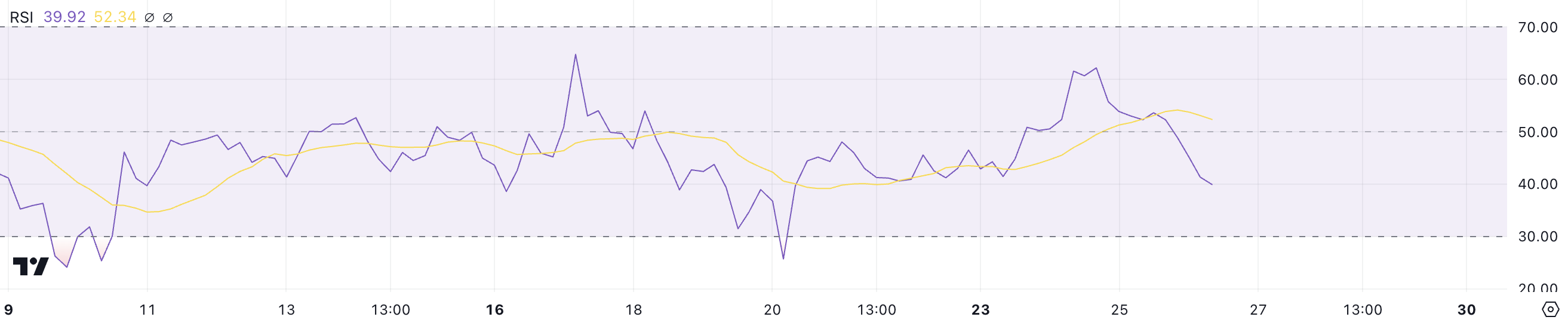 RSI, एक मोमेंटम ऑसिलेटर, 0 से 100 के पैमाने पर प्राइस चेंज की गति और परिमाण को मापता है। 70 से ऊपर के मान ओवरबॉट कंडीशंस को इंगित करते हैं जो अक्सर प्राइस करेक्शन से पहले होते हैं, जबकि 30 से नीचे के मान ओवरसोल्ड कंडीशंस का सुझाव देते हैं, जो संभावित रूप से रिबाउंड का संकेत देते हैं।