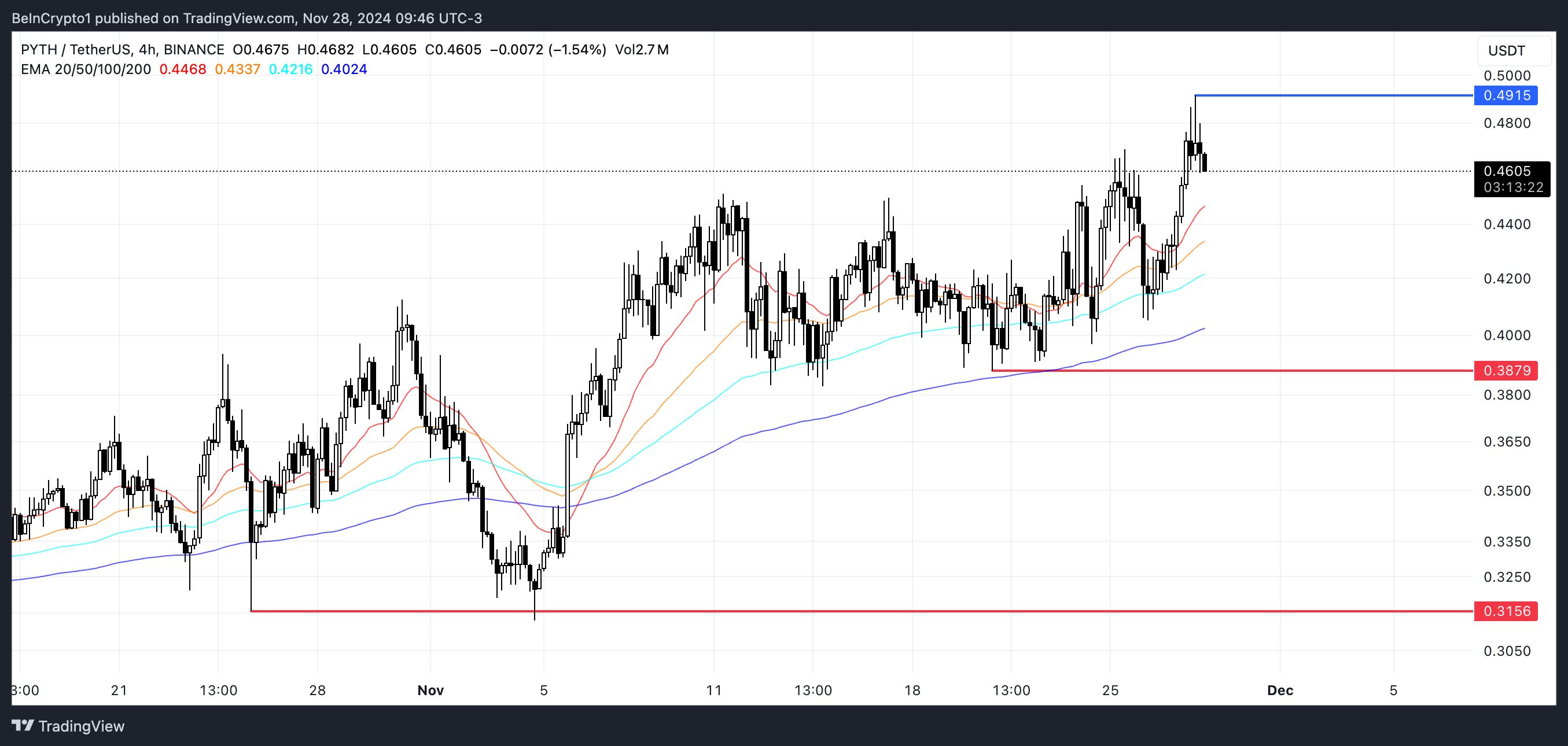 Pyth (PYTH), Pyth Network का नेटिव टोकन, पिछले 30 दिनों में 27.14% बढ़ा है, जो मार्केट डेटा के लिए ब्लॉकचेन ओरेकल में नई रुचि को दर्शाता है। जबकि PYTH ने 16 मार्च, 2024 को $1.15 का ऑल-टाइम हाई प्राप्त किया, इसकी कीमत उस स्तर से लगभग 60% नीचे बनी हुई है।