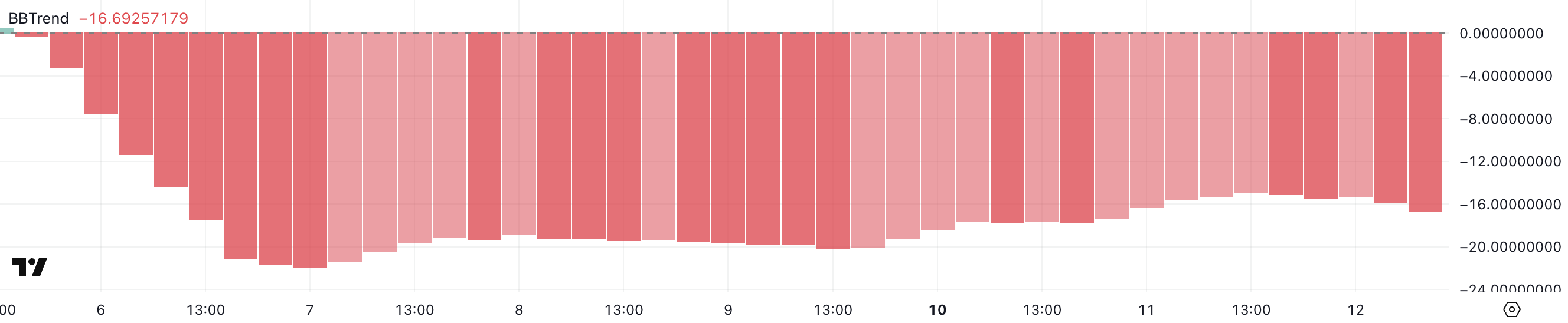 Hyperliquid का BBTrend वर्तमान में -16.69 पर है, जो 5 मार्च से नकारात्मक बना हुआ है और पिछले छह दिनों से -10 से नीचे है।