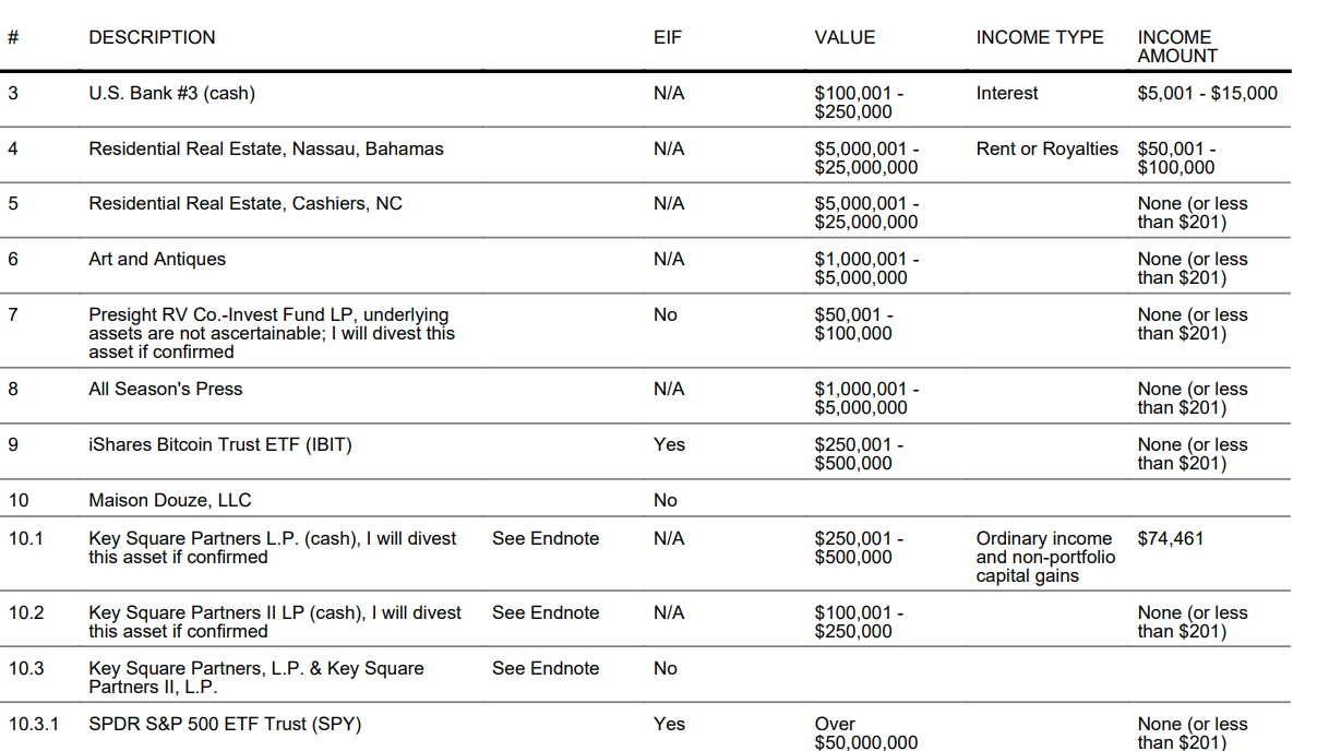 उनकी कुल वित्तीय संपत्तियाँ, जैसा कि खुलासा किया गया है, लगभग $521 मिलियन मूल्य की हैं। रिपोर्ट में कई उच्च-मूल्य की होल्डिंग्स का संकेत दिया गया है, जिसमें हेज फंड से जुड़े निवेश, US Treasury बिल्स, और करेंसी मार्केट पोजीशन्स शामिल हैं।