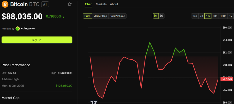 इसी वजह से, Bitcoin की हाल की स्टेबलिटी भी खास रही है। इस आर्टिकल को लिखने तक, BTC लगभग $88,035 पर ट्रेड हो रहा था, जो पिछले 24 घंटों में लगभग 1% ऊपर है।