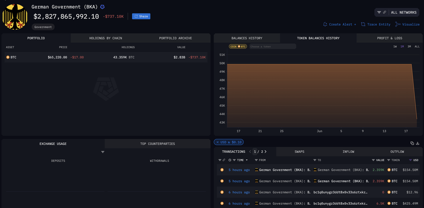 आज, “जर्मन सरकार (BKA)” के नाम से लेबल किए गए एक वॉलेट ने Arkham, एक क्रिप्टो ऑन-चेन एनालिटिक्स फर्म द्वारा, महत्वपूर्ण Bitcoin (BTC) लेन-देन शुरू किए। इन गतिविधियों ने क्रिप्टो समुदाय में व्यापक जिज्ञासा पैदा कर दी है।
