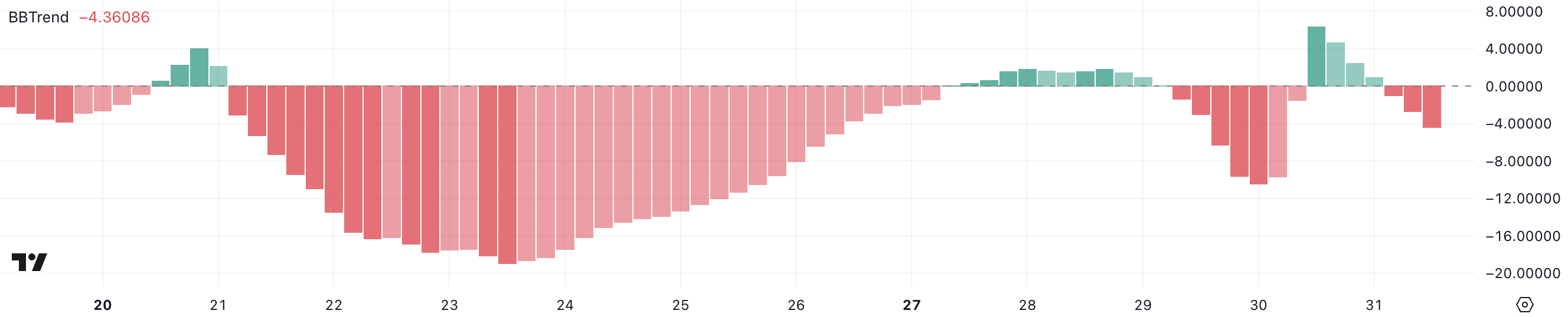 BBTrend एक ट्रेंड स्ट्रेंथ इंडिकेटर है जो Bollinger Bands से प्राप्त होता है, जो प्राइस मोमेंटम को उसकी वोलैटिलिटी रेंज के सापेक्ष मापता है। एक सकारात्मक BBTrend बुलिश मोमेंटम को इंगित करता है, जबकि एक नकारात्मक रीडिंग बढ़ते bearish प्रेशर का सुझाव देती है।