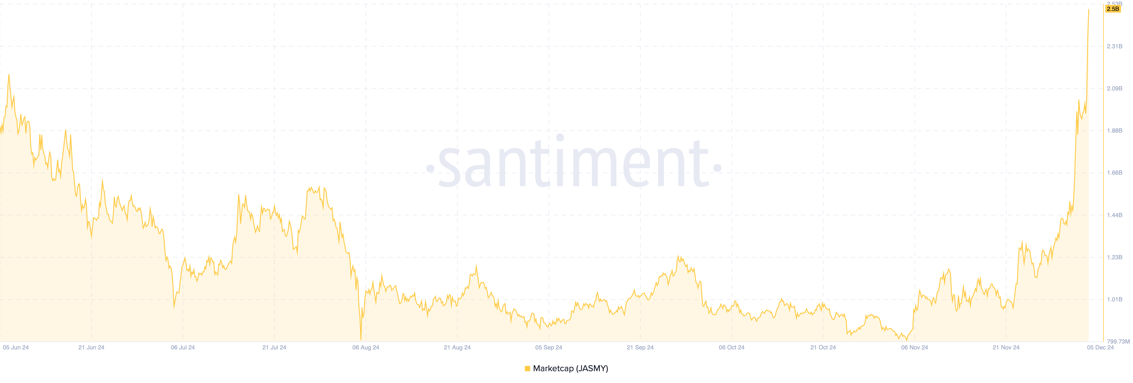 Santiment के अनुसार, JASMY का मार्केट कैप $2.50 बिलियन तक बढ़ गया है, जो बाजार सहभागियों के बीच इसकी बढ़ती लोकप्रियता और altcoin की बढ़ती मांग को दर्शाता है।