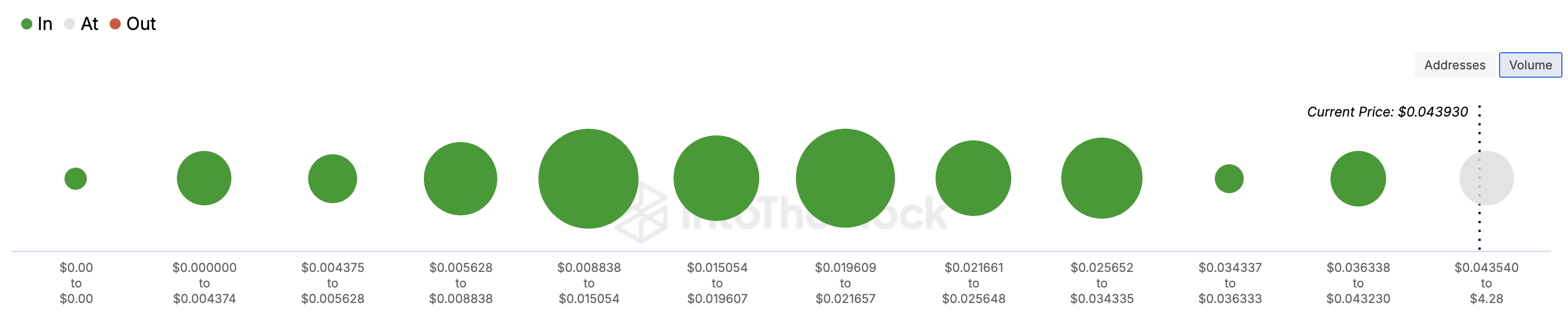 GIOM मेट्रिक सभी एड्रेस पोजीशन्स को क्लस्टर्स में एकत्रित करता है जो विशिष्ट मूल्य स्तरों पर खरीदे गए एड्रेस की मात्रा या संख्या पर आधारित होते हैं। बड़े क्लस्टर्स उन मूल्य रेंज के आसपास मजबूत समर्थन या प्रतिरोध का संकेत देते हैं।