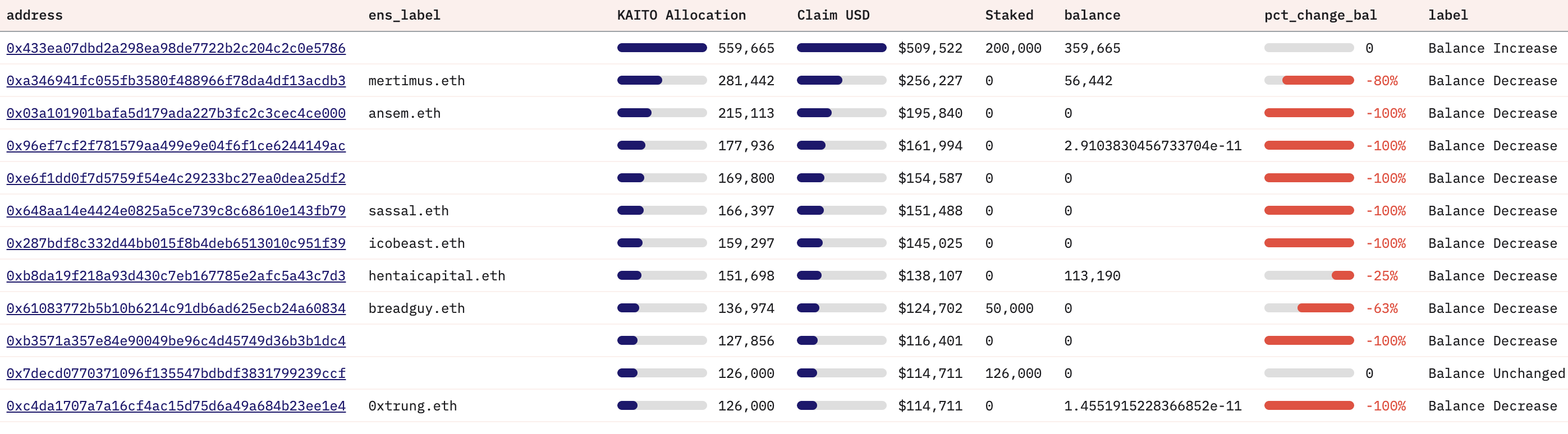 विस्तृत ऑन-चेन गतिविधि एक समान पैटर्न दिखाती है, जिसमें 76.7% सभी उपयोगकर्ता जिन्होंने KAITO क्लेम किया, उनके बैलेंस में कमी का अनुभव हुआ।
