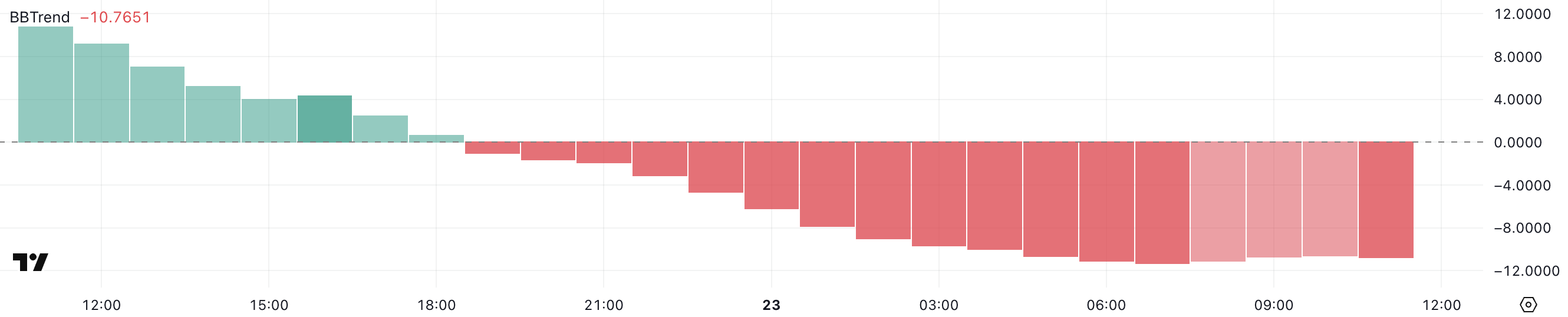 तेजी से बदलाव यह सुझाव देता है कि bearish सेंटिमेंट हावी हो रहा है, क्योंकि BBTrend का नेगेटिव होना अक्सर डाउनट्रेंड की शुरुआत का संकेत देता है।