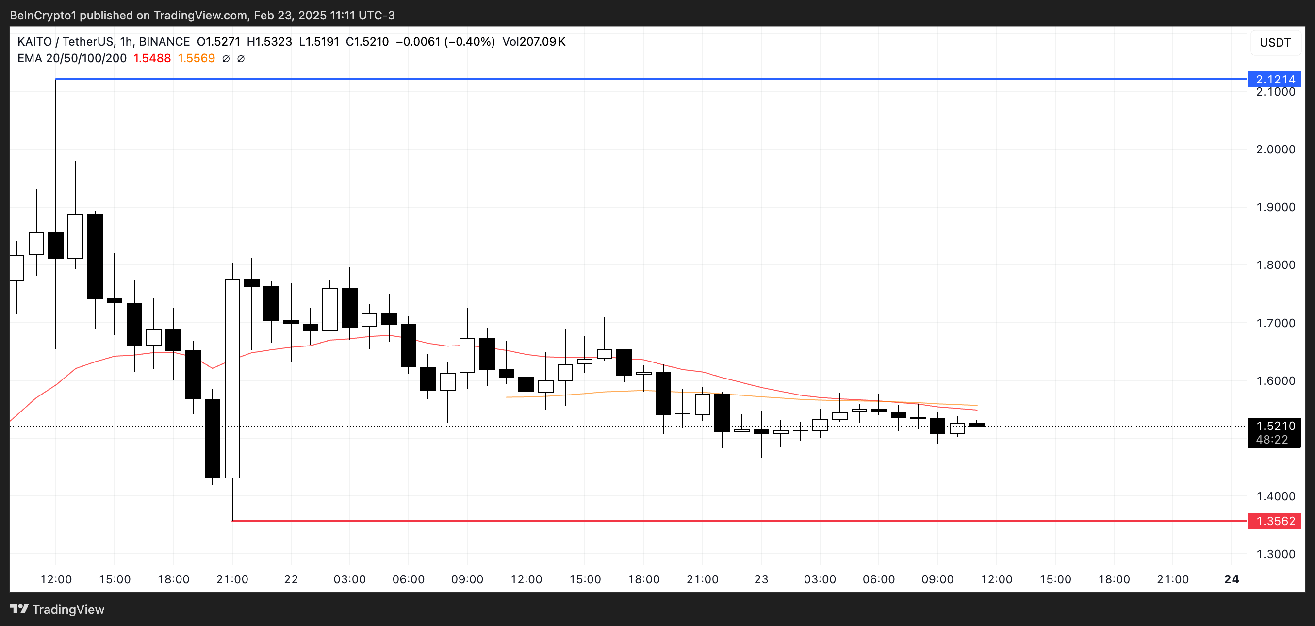 KAITO ने 21 फरवरी को लगभग $2 के ऑल-टाइम हाई को छुआ, लेकिन इसके तुरंत बाद, यह नीचे की ओर करेक्शन करने लगा। यह पुलबैक अधिकतम लाभ लेने या पीक पर पहुंचने के बाद कमजोर खरीद दबाव का सुझाव देता है।